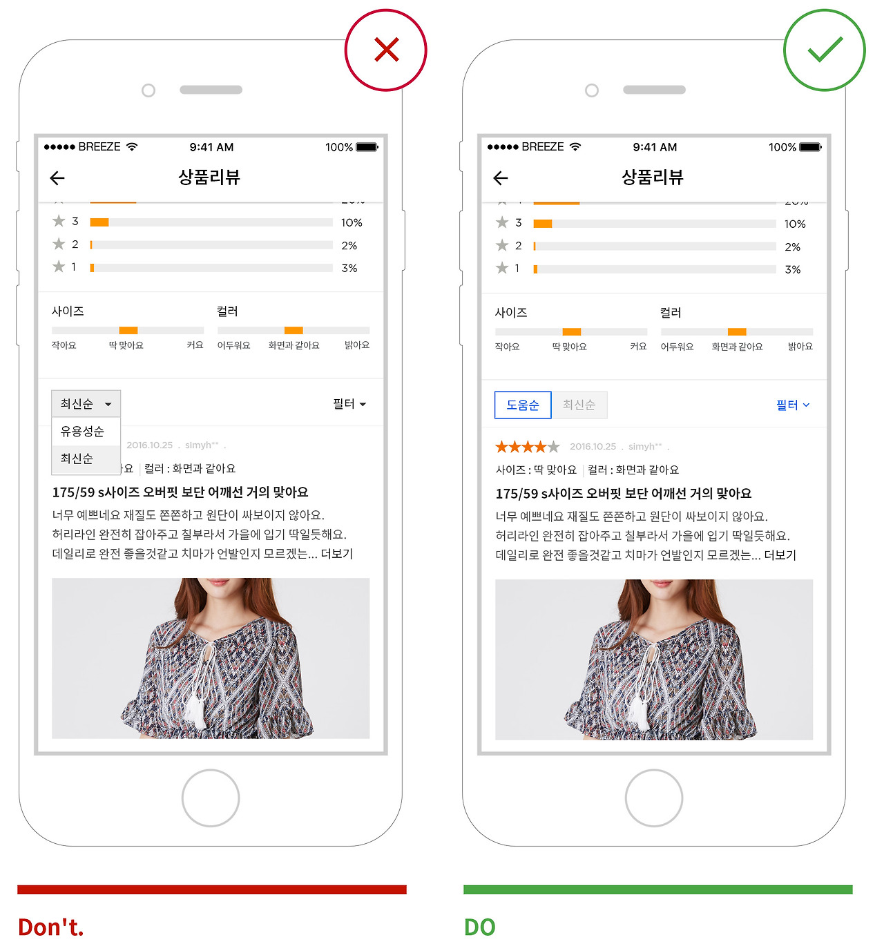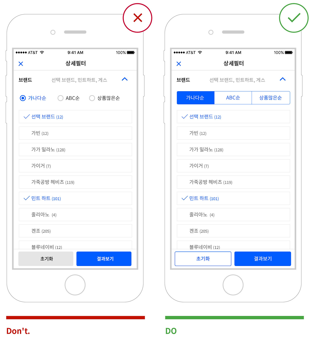 라디오 버튼은 선택과 관련된 기능에서만 사용되어야 합니다. 라디오 버튼을 텝했을 경우 하나의 옵션만 선택 상태가 변경되고 그 외의 액션이 실행되지 않아야 합니다. 따라서 사용자가 옵션을 선택했을 때 화면의 상태가 바뀌는 액션 실행은 iOS의 세크멘트 컨트롤이나 텝tab 으로 디자인되어야 합니다.