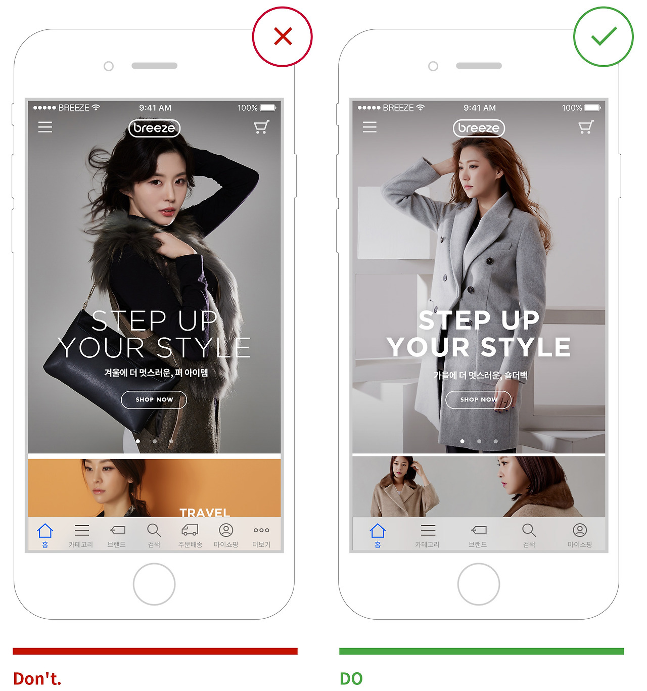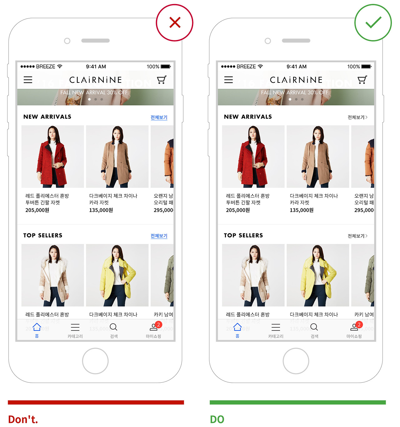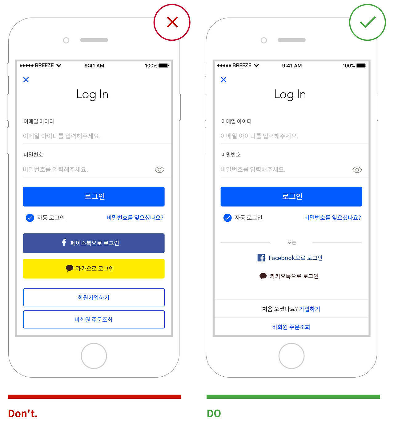 테두리(베젤)를 사용해서 터치할 수 있다는 것을 표현하기보다는, 버튼 레이블을 의미 있는 단어로 지정하고 메인 컬러나 시스템 컬러를 사용해서 해당 요소가 인터랙션 가능하다는 것을 알립니다.