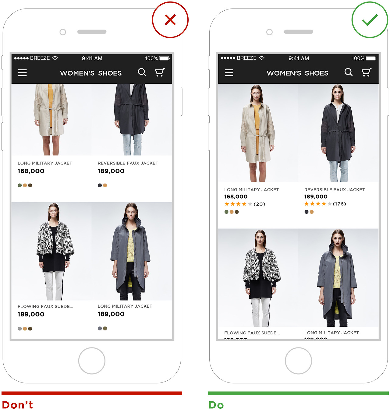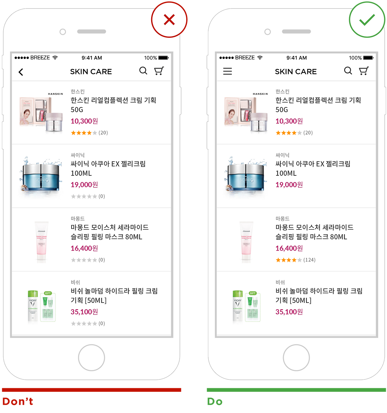 소셜 프루프 측면에서 보면 얼마나 많은 사람이 상품 리뷰를 남겼는지가 더 영향력이 있습니다. 페이스북 'Like'의 숫자를 노출하는 것처럼 얼마나 많은 사용자가 상품 리뷰를 썼는지, 위시리스트에 담았는지, 상품을 공유했는지는 구매 결정에 신뢰도를 높입니다. 따라서 상품 리스트에서 상품 리뷰 노출은 별점과 상품 리뷰 수 조합을 기본으로 합니다. 평가 점수는 신뢰할 만한 강력한 설득력이 있을 경우만 노출합니다.