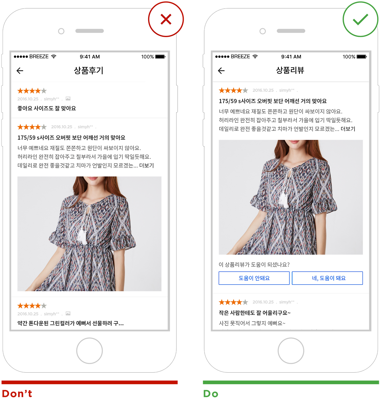 만약 많은 리뷰를 성공적으로 유치했다면 이제는 많은 리뷰를 어떻게 관리해서 사용자에게 유용하게 제공할 방법을 고민해야 합니다. 리워드를 통한 리뷰 유치의 단점은 '좋아요' 정도의 간단한 감정 표현 리뷰가 많아진 다는 점입니다. 이런 리뷰는 구매를 고려하는 사용자에게는 그리 유용한 정보가 되지 않습니다. 고객은 많은 리뷰를 읽어볼 시간이 없기 때문에 구매 결정에 도움이 되는 양질의 리뷰를 선택적으로 제공해야 합니다. 신뢰도와 유용성을 높이는 해결책 중 하나는 위 예에서 같이 리뷰 평가를 요청하고 평가가 높은 리뷰를 상위에 노출하여 유용한 순서대로 보여 주는 것입니다. 상품리뷰에 포함된 고객인 올린 이미지를 우선적으로 노출하는 것도 하나의 방법입니다. 이미지는 여러 글보다 훨씬 효과적입니다. 상품의 실제 사이즈는 상품정보에 있는 수치 정보보다 상품을 구매한 고객이 올린 사진이 보다 직관적인 정보를 제공합니다.