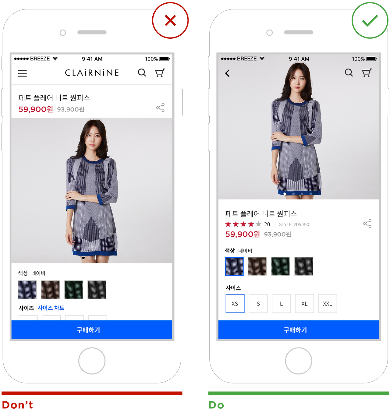 상품 상세 페이지에서 스크롤하기 전에 상품 리뷰 평가와 리뷰 수가 노출되어야 합니다. 상품 리뷰는 훌륭한 구매 동기입니다. 따라서 상품 명과 가격만큼 중요한 위치에 있어야 합니다. 리뷰를 상품 정보의 부가적인 정보로 다루지 마세요. 다른 사람들이 상품을 구입하고 좋아한다고 생각하면 상품 품질 및 신뢰성에 대한 고객의 신뢰가 크게 높아집니다.