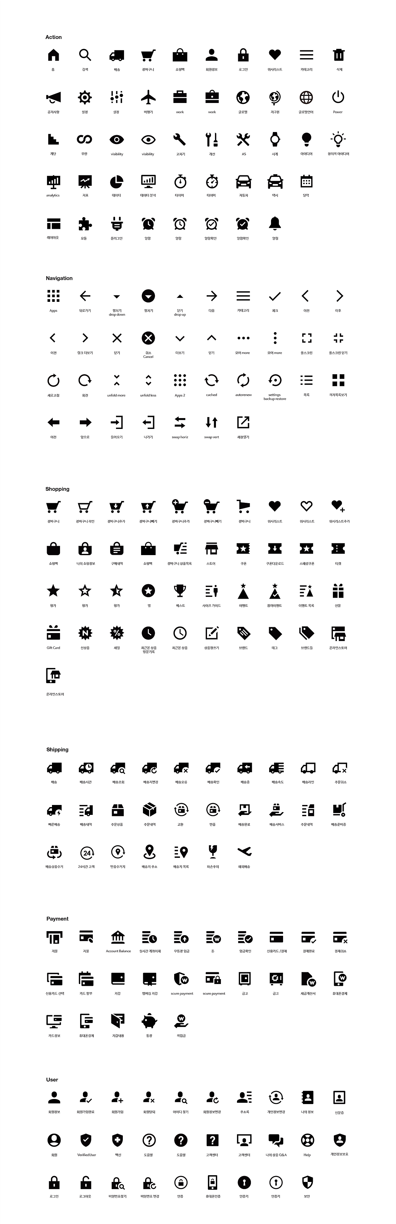 커머스 관련 아이콘을 공유합니다. 일러스트로 디자인했고 약 390개 정도 됩니다. 아래 파일 다운로드하시고 압축을 푸시면 AI파일로 일러스트레이터에서 열어서 사용하실 수 있습니다. 레이어로 그리드도 같이 있어 수정해서 쓰실 수 있습니다. 안드로이드 아이콘을 기반으로 디자인을 변형했습니다. 안드로이드 아이콘의 라운드를 최소화해서 좀 더 세련련돼 보이도록 했습니다. 거기에 커머스 관련 아이콘을 추가했습니다. 크기는 24픽셀로 작업해서 웹사이트와 모바일 앱 모두 사용 가능합니다.
