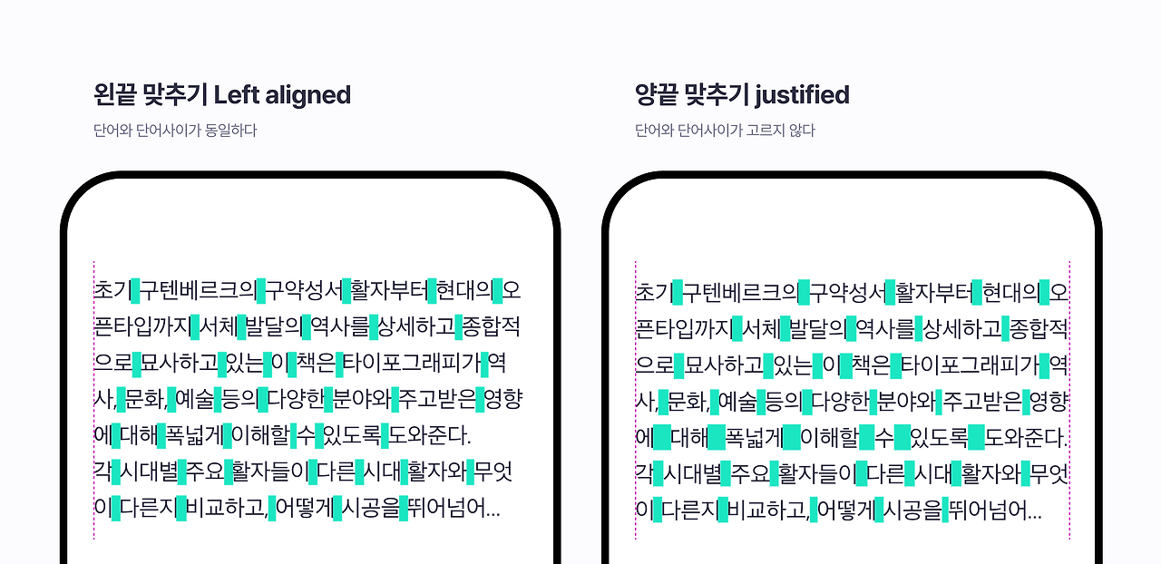 신문이나 잡지 같은 인쇄물에서는 양끝 맞추기가 일반적으로 사용돼 왔지만 모바일에서는 거의 사용하지 않는 정렬 방식이다. 모바일과 웹은 스크롤하면서 읽고 화면의 크기가 다양해서 글줄의 길이가 가변적이라 고르지 못한 자간과 어간을 수정할 수 없다. 미디엄 Medium과 같이 타이포그래피가 매우 잘 디자인되었다고 평가받는 앱의 본문도 왼쪽 맞추기를 적용한다.(브런치는 양끝 맞추기로 정렬되어 있어 어간이 고르지 않다.)