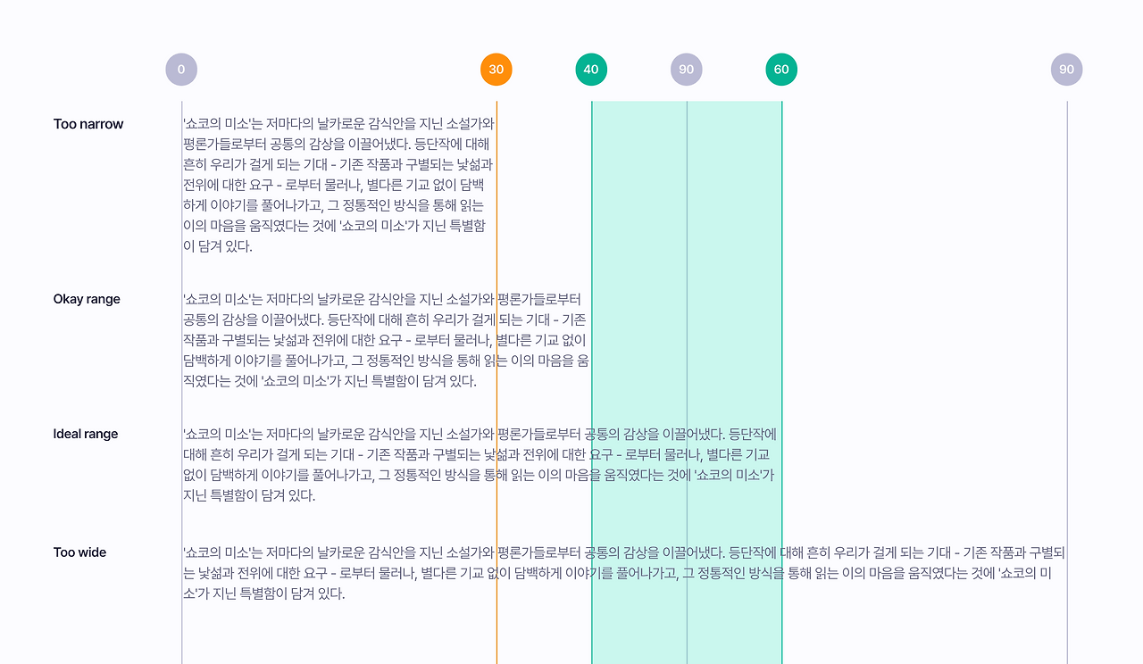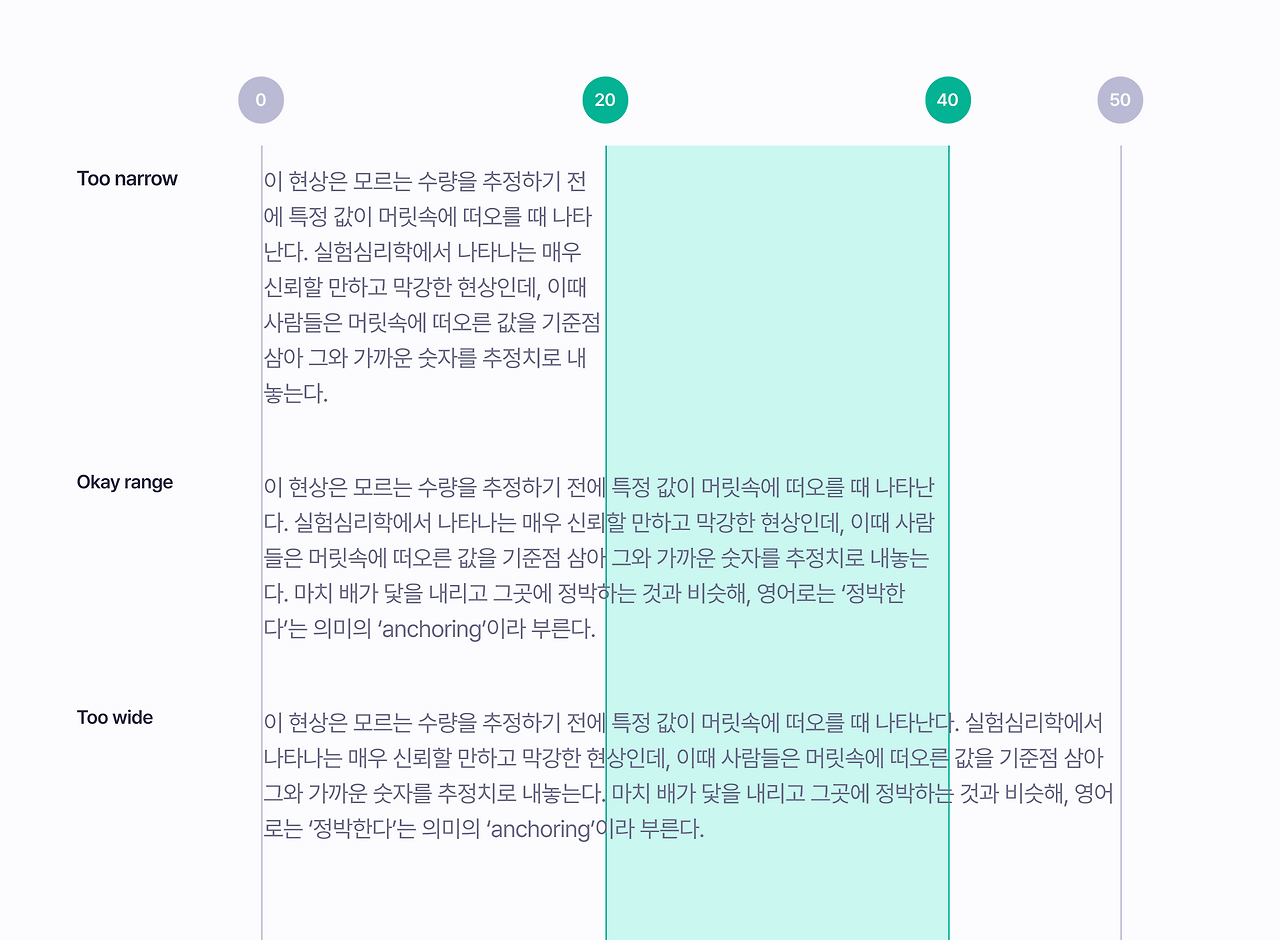 320 ~ 430픽셀 정도의 화면이 작은 모바일에서는 글줄의 길이는 한 줄에 20-40자가 적정하다.