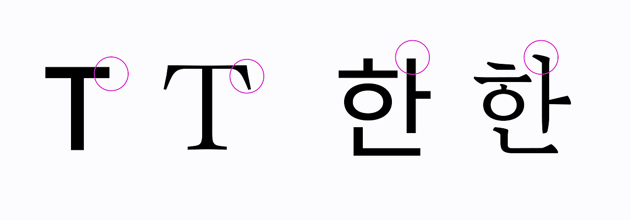 이에 비해 고해상도를 기반으로 하는 인쇄에서는 이런 점이 오히려 단점이 될 수 있기 때문에 인쇄용 폰트는 획의 끝맺음이 날카롭고 가로세로 줄기도 대비를 이룬다.