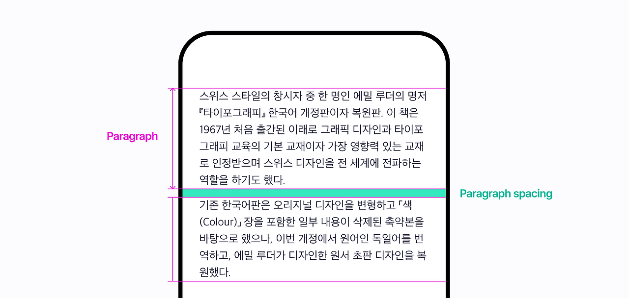 모바일 콘텐츠의 특성상 콘텐츠를 빠르게 스캔할 수 있도록 단락 구분은 제목과 단락 간격 Paragraph spacing을 사용한다. 단락 간의 간격은 본문 글꼴 크기의 75%가 적정하다. 문단의 글꼴 크기가 16px라면 단락의 간격은 12px을 줄 수 있다.