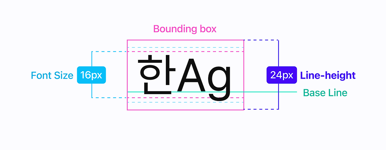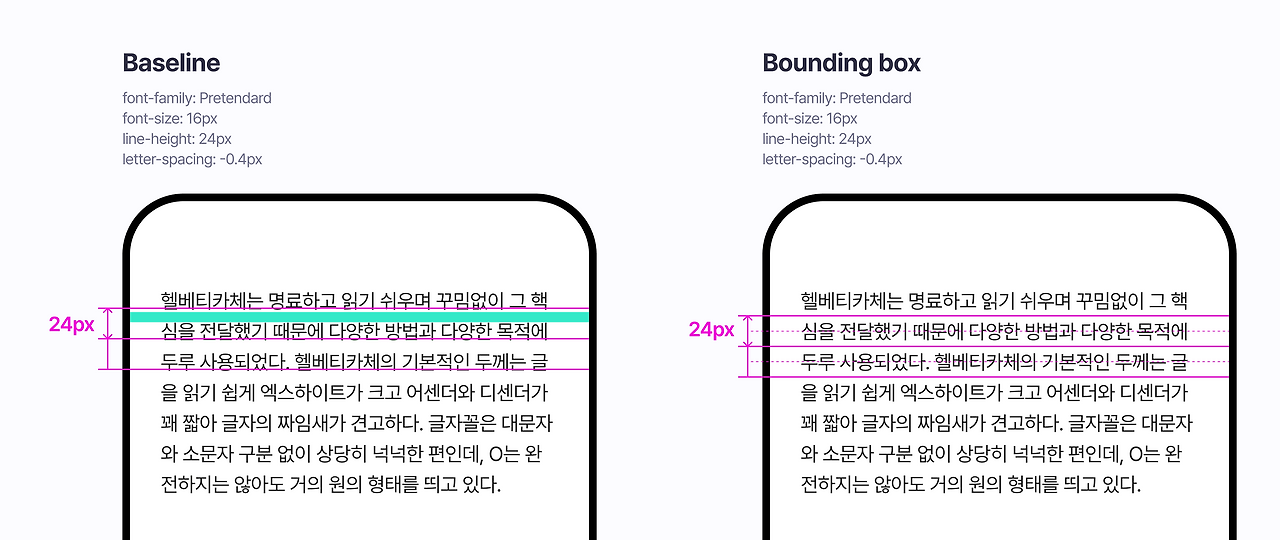 웹과 iOSI에서는 줄 높이와 바운딩 박스 높이가 동일하다. 즉 16px크기의 글자 크기에 행간을 24px로 했을 때 바운딩 박스의 높이도 24px이다. 이 높이를 바탕으로 글줄 또는 글은 인터페이스에 배치된다. 바운딩 박스는 웹과 iOS 앱에서 이 방법을 사용한다.