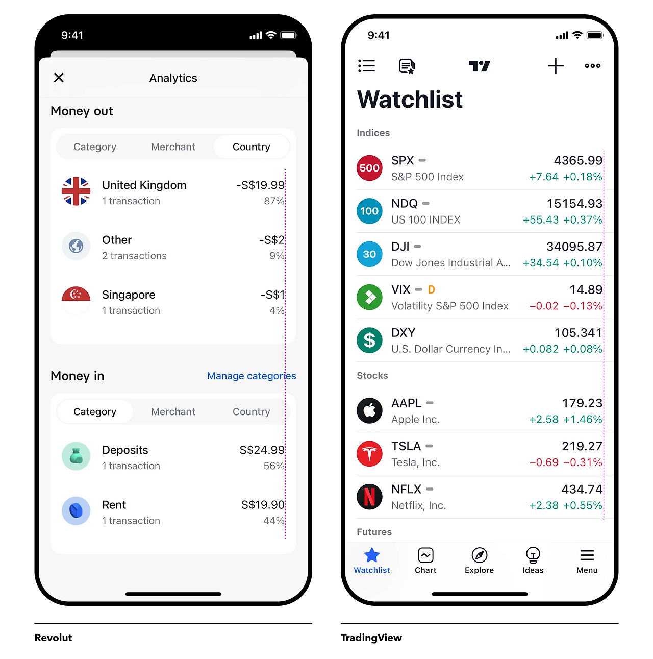 테이블, 카드 Card 또는 리스트 List를 디자인할 때 숫자와 시간을 오른쪽에 맞춘다. 숫자를 왼쪽 정렬된 정보와 바로 맞은편에 배치하면 수의 많고 적음을 한눈에 비교하기가 더 쉽다.