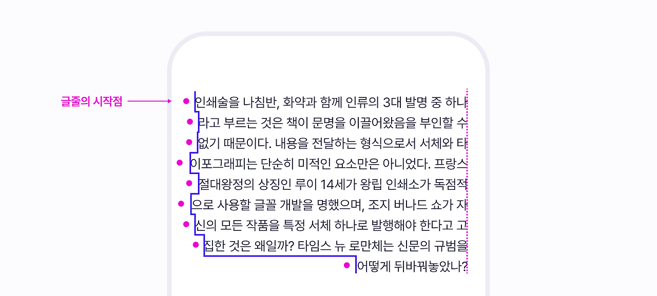 가독성이 중요한 많은 양의 글에서는 왼끝 맞추기 또는 양끝 맞추기를 적용해야 한다.