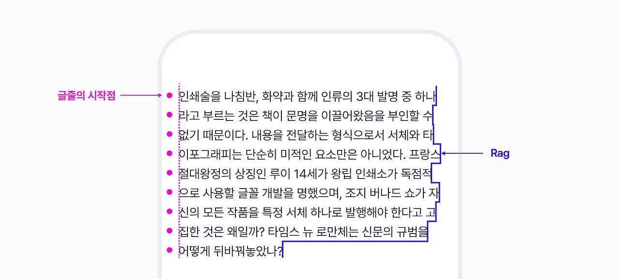 타이포그래피의 정렬은 페이지나 컨테이너의 여백을 기준으로 인쇄 또는 디지털에 상관없이 글 Text가 배치되는 기준을 의미한다. 모바일에서 글 Text이 정렬되는 방식은 네 가지로 왼끝 맞추기, 양끝 맞추기, 오른 끝 맞추기, 중앙 맞추기가 있다. 디자인의 목적과 콘텐츠의 성격, 의도된 사용자 경험에 따라 정렬 방법을 선택해야 한다.