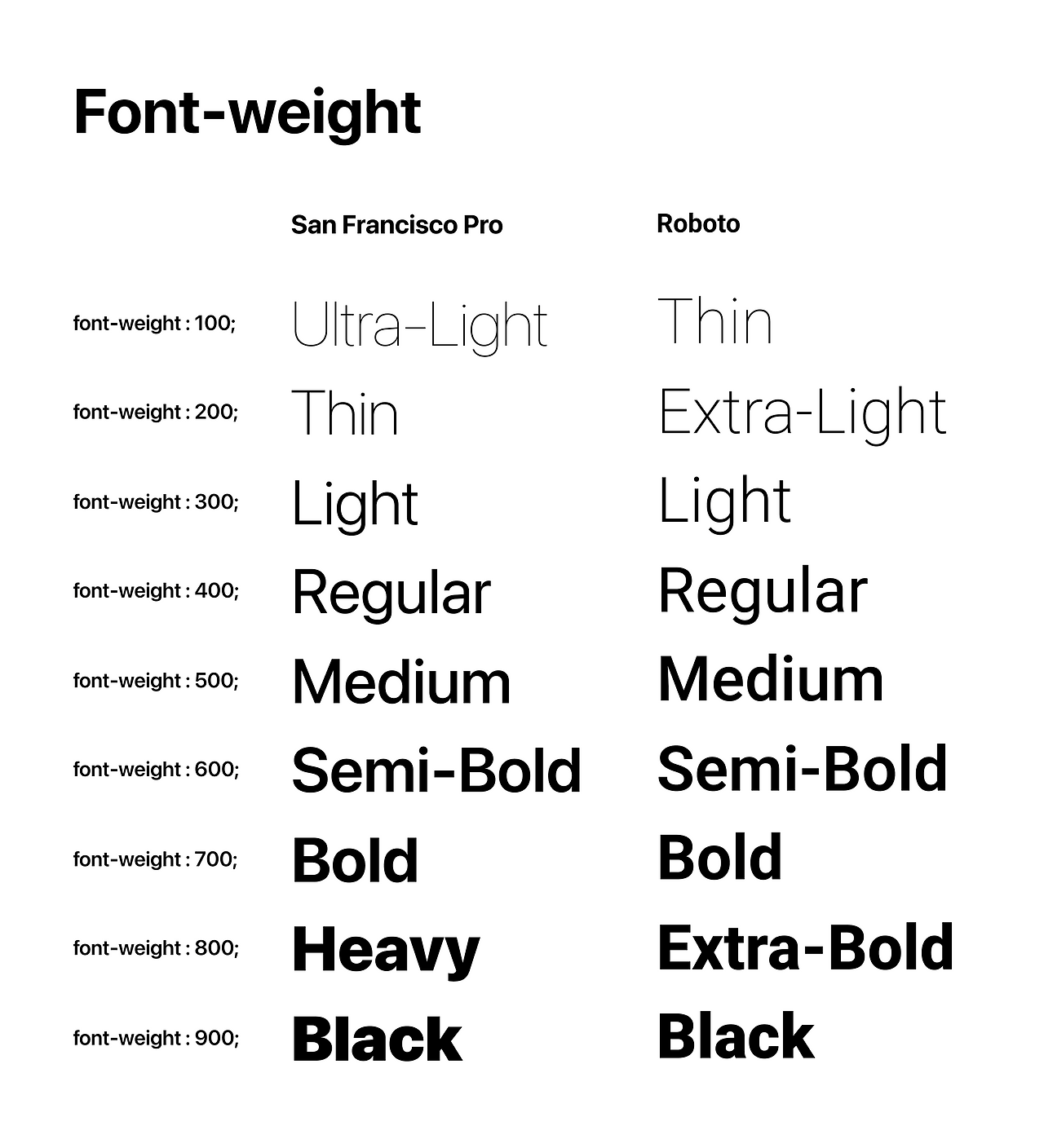 폰트의 굵기를 정하는 Font-weight는 디자이너의 경우 Regular, Bold로 설정하지만 숫자로도 설정할 수 있다. 100에서 900까지의 범위가 가능하고 Regular(Normal)는 400과 같고 Bold는 700과 같고, Medium은 500과 같다.