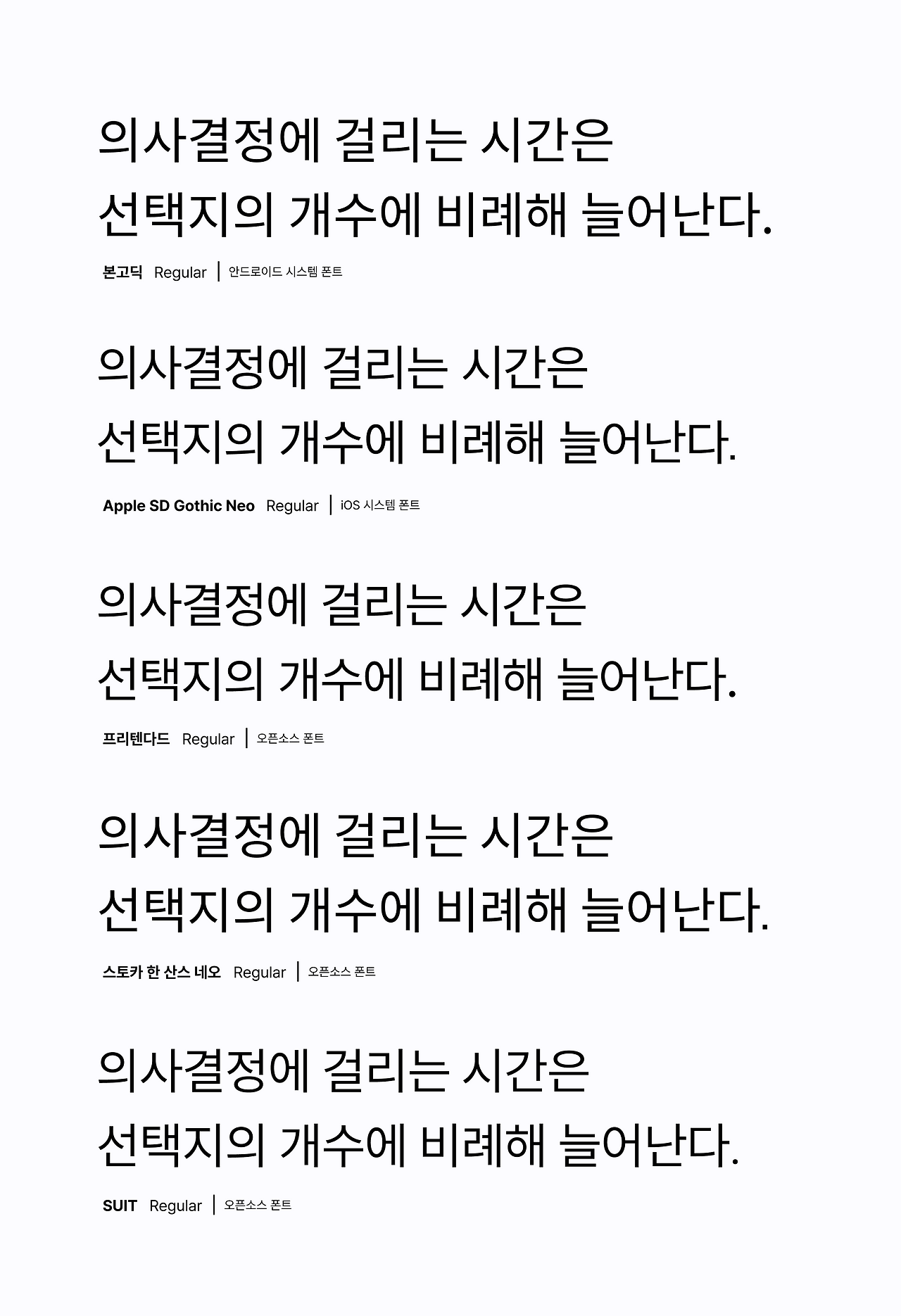 모바일에 사용하는 대표적인 본문용 글꼴들이다. 언뜻 보면 형태가 크게 차이가 나보이지 않는다.