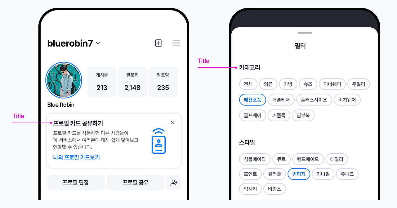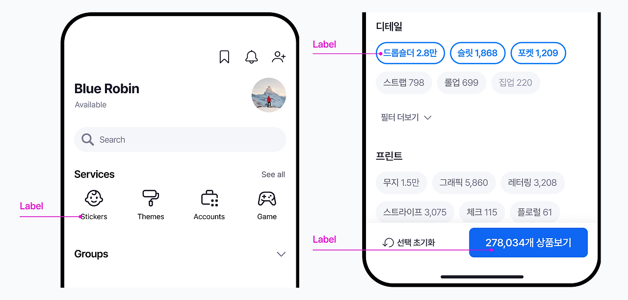 레이블 Label은 인터페이스에서만 사용되는 개념이다. 버튼, 메뉴명, 텝 Tab, 리스트 List, 아이콘과 함께 사용하는 텍스트 등이 모두 레이블이다. 인터페이스 요소의 기능이나 작업 task를 설명한다. 사용자가 UI를 직관적으로 이해하고 사용할 수 있도록 안내하는 역할을 한다. 레이블은 짧고 간결하게 작성해야 한다.