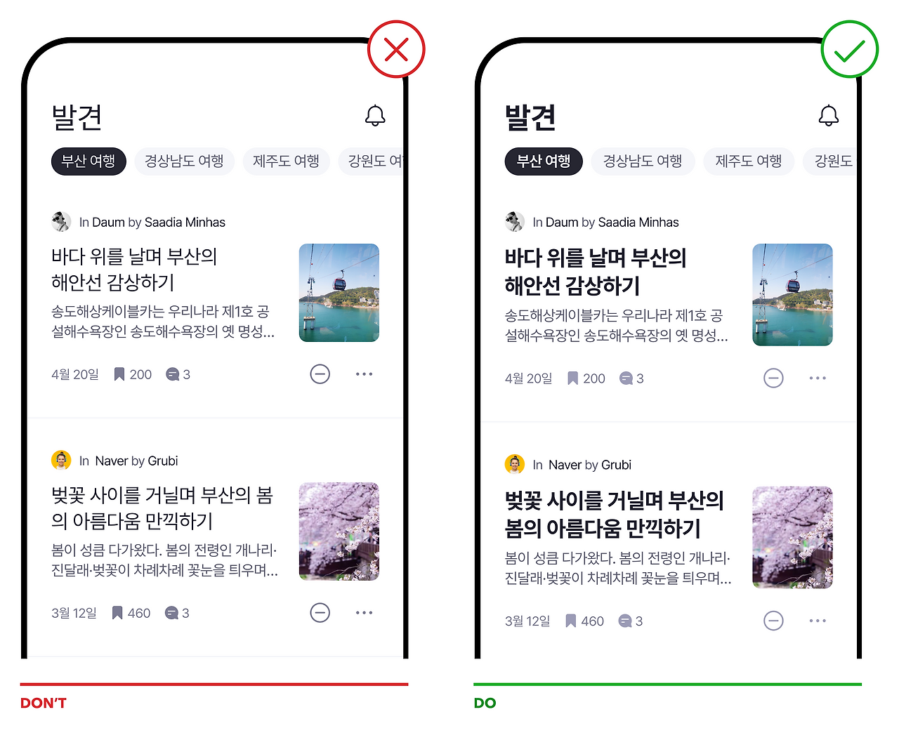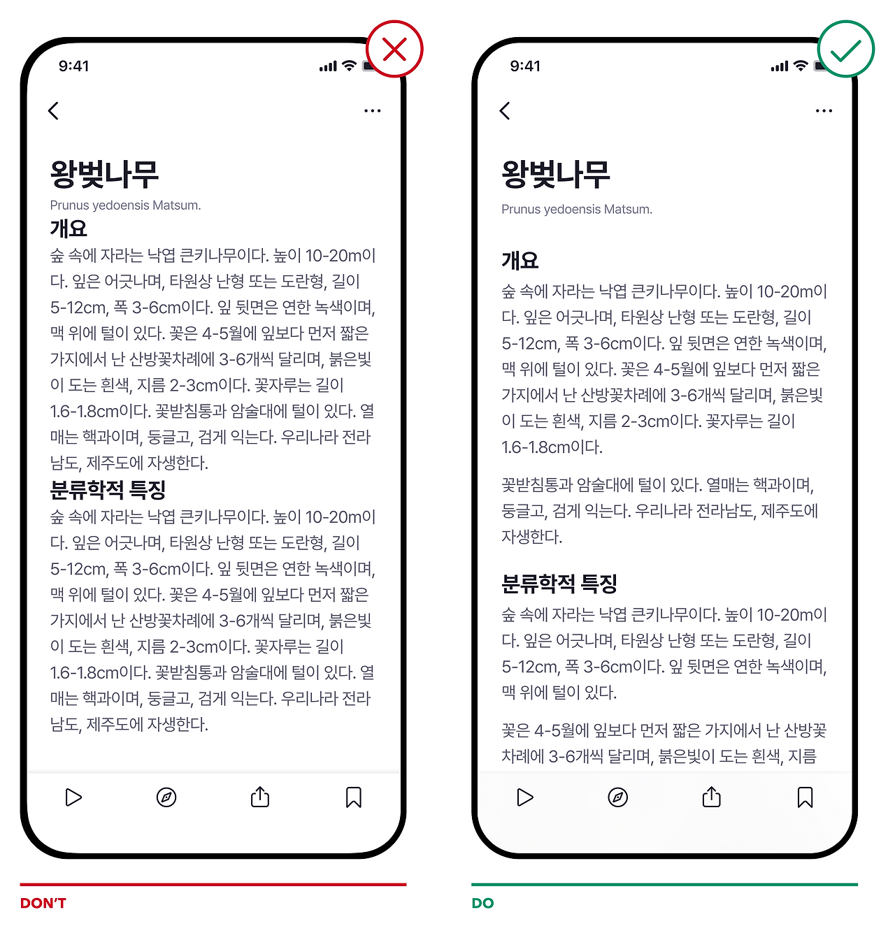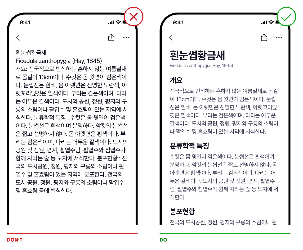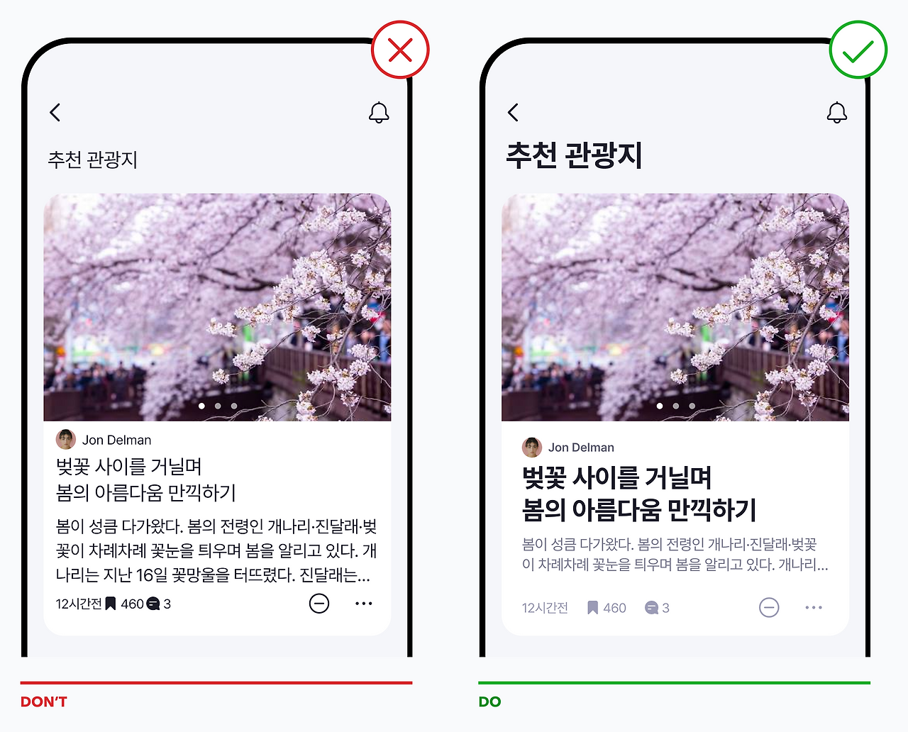 타이포그래피에서 가독성이 쉽고 효율적인 읽기에 집중한다면, 계층 Hierarchy은 정보를 빠르게 파악할 수 있도록 돕는다. 사용자는 모바일에서 긴 글을 집중해서 읽기도 하지만 대부분 스크롤하면서 훑어본다. 따라서 빠르게 읽을 만한 정보를 탐색하고 중요한 정보를 파악할 수 있도록 타이포그래피 계층이 필요하다.