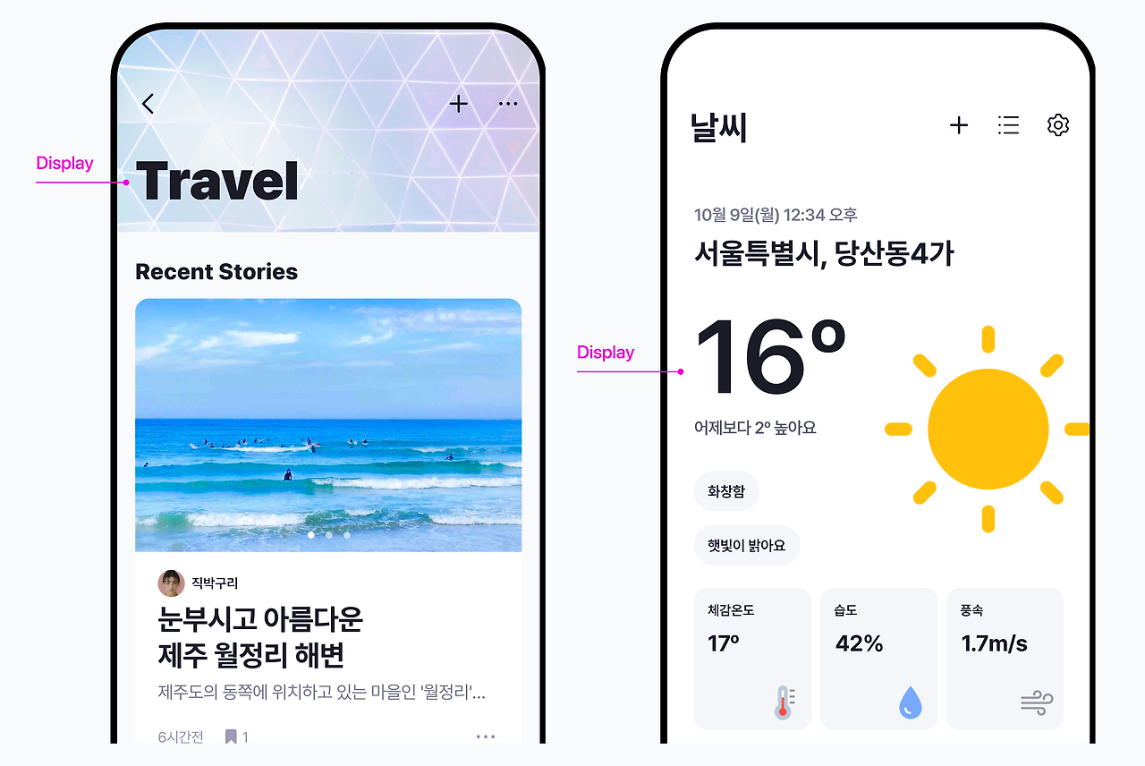 화면에서 가장 큰 텍스트이다. 짧고 중요한 텍스트나 숫자에 사용한다. 모바일 화면에서 계층 구조를 표현하는 데 사용하기도 하지만 숫자나 시선을 집중하는 데 사용한다. 일기예보 앱의 온도나 은행앱의 계좌 금액 등에 사용한다. 인터페이스보다는 시각적 표현이 중요한 화면의 제목을 강조할 때 사용하기도 한다.