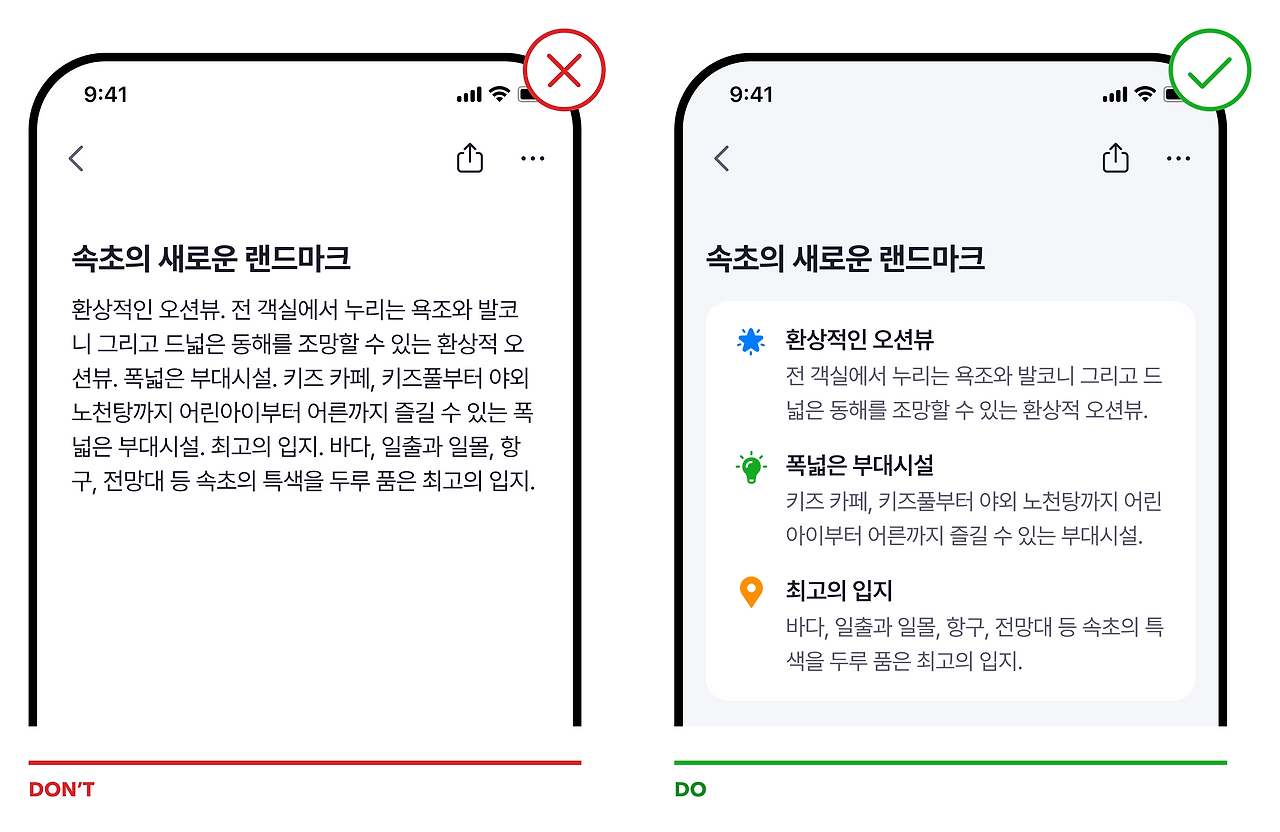 명확한 타이포그래피 계층은 사용자가 정보를 빠르게 이해할 수 있게 한다. 사용자는 가장 중요한 정보를 즉시 파악하고 한눈에 이해할 수 있다. 콘텐츠의 우선순위와 구조가 미리 정리되어 있어 사용자가 페이지를 따로 분석할 필요가 없다. 스크롤하면서 원하는 정보를 빠르게 찾고, 중요도에 따라 자연스럽게 처리할 수 있다.