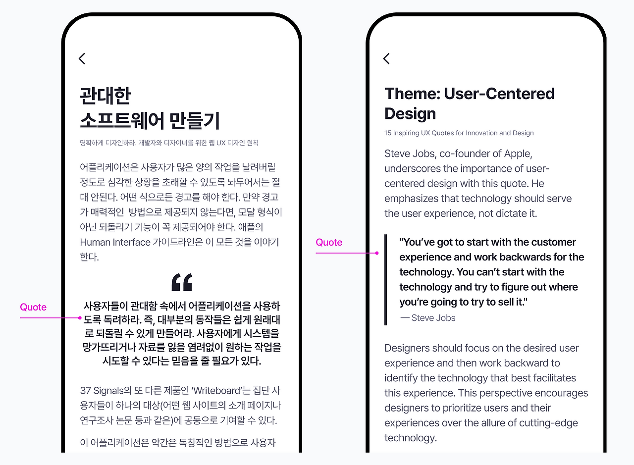 인용문 Quote은 다른 사람의 말이나 글에서 특정한 부분을 가져와 그대로 사용하여 글의 신뢰성을 높이고, 논리적인 근거를 제시한다. 인용문은 인용된 사실을 분명히 알 수 있도록 본문과 시각적 속성이 뚜렷하게 달라야 한다. 인용문의 타입의 크기, 서체, 단락 들여 쓰기, 색 등으로 본문과 차별화를 꾀할 수 있다.