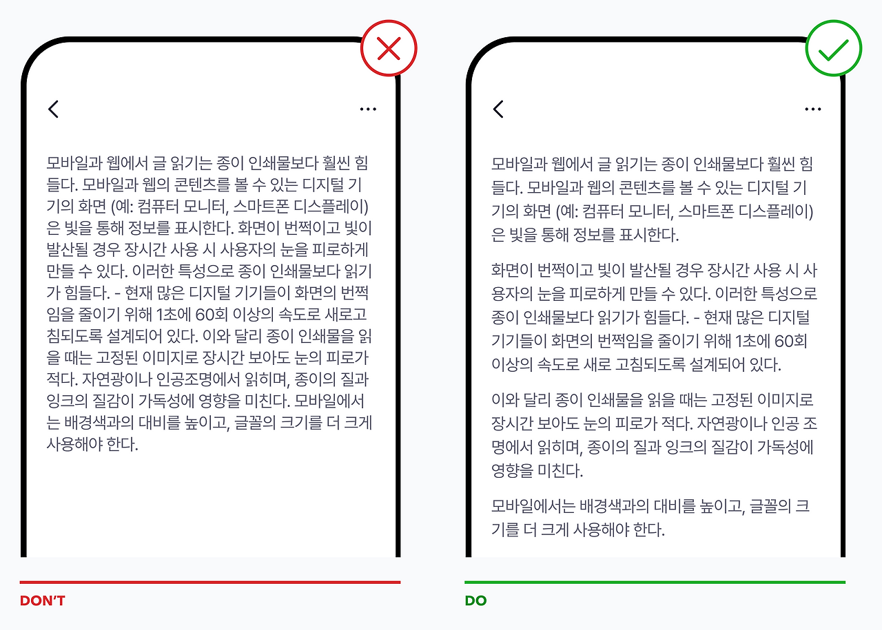 본문 Paragraph은 블로그나 뉴스의 긴 글을 말한다. Body라고도 한다. 인터페이스에서 두줄이상의 문단으로 나뉠 수 있는 긴 글에 적용한다. 본문 스타일은 앱에서 긴 텍스트 구절에 사용된다. 작은 크기에서도 읽을 수 있고 긴 구절에서도 편안하게 읽을 수 있는 본문 전용 글꼴을 사용한다.
