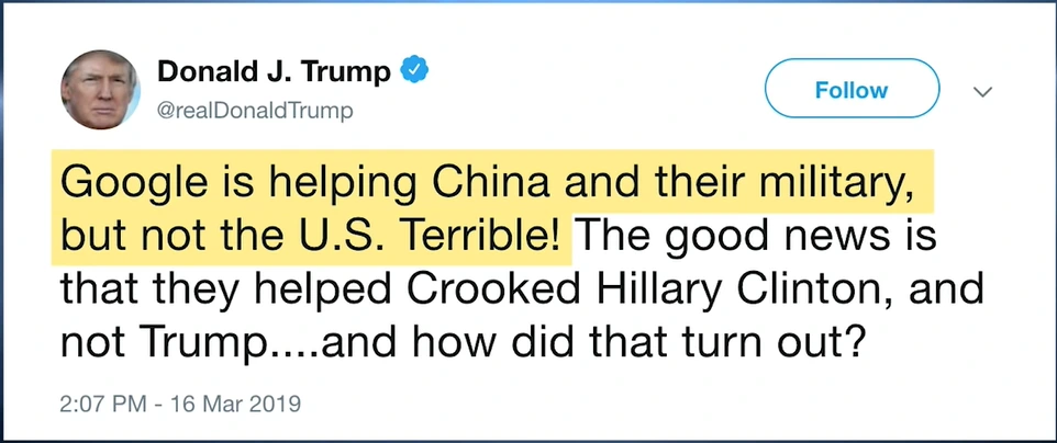 하지만 여기 까지라면 구글이 충분히 조심한다면 중국 공산당이나 중국 인민 해방군과 협력하고 있다는 이야기를 들을 이유는 없을 것이다. 게다가 이번 미중 무역 전쟁에서 구글은 중국에 더 이상 안드로이드 OS를 화웨이에 제공하지 않겠다고 선언하는 등 트럼프 행정부에 협조적인 모습을 보인 것도 사실이다.