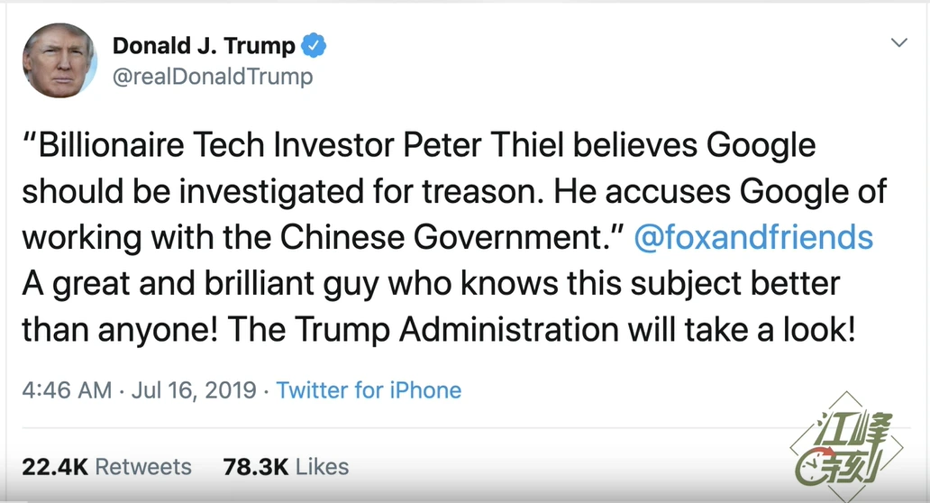 여기에 기름을 부은 것이 Peter Thiel이다. Peter Thiel은 PayPal의 창업자이며 페이스북 창업자들 중 하나이기도 하다. 말하자면 멘처 기업가이며 신흥 재벌 중의 한 사람이다. 이런 사람이 구글의 의혹을 보다 확대하는 발언을 한 것이다. 그는 심지어 반역죄까지 들먹여 가며 구글의 의혹을 제기하였고 미국 정부의 조사를 촉구했다. 트럼프 대통령은 우리를 실망시키지 않았다. 그는 역시 트위트를 하여 이 사건에 대한 관심을 표명하였는데 이 사건에 대해 정부가 조사할 것임을 시사하였다.