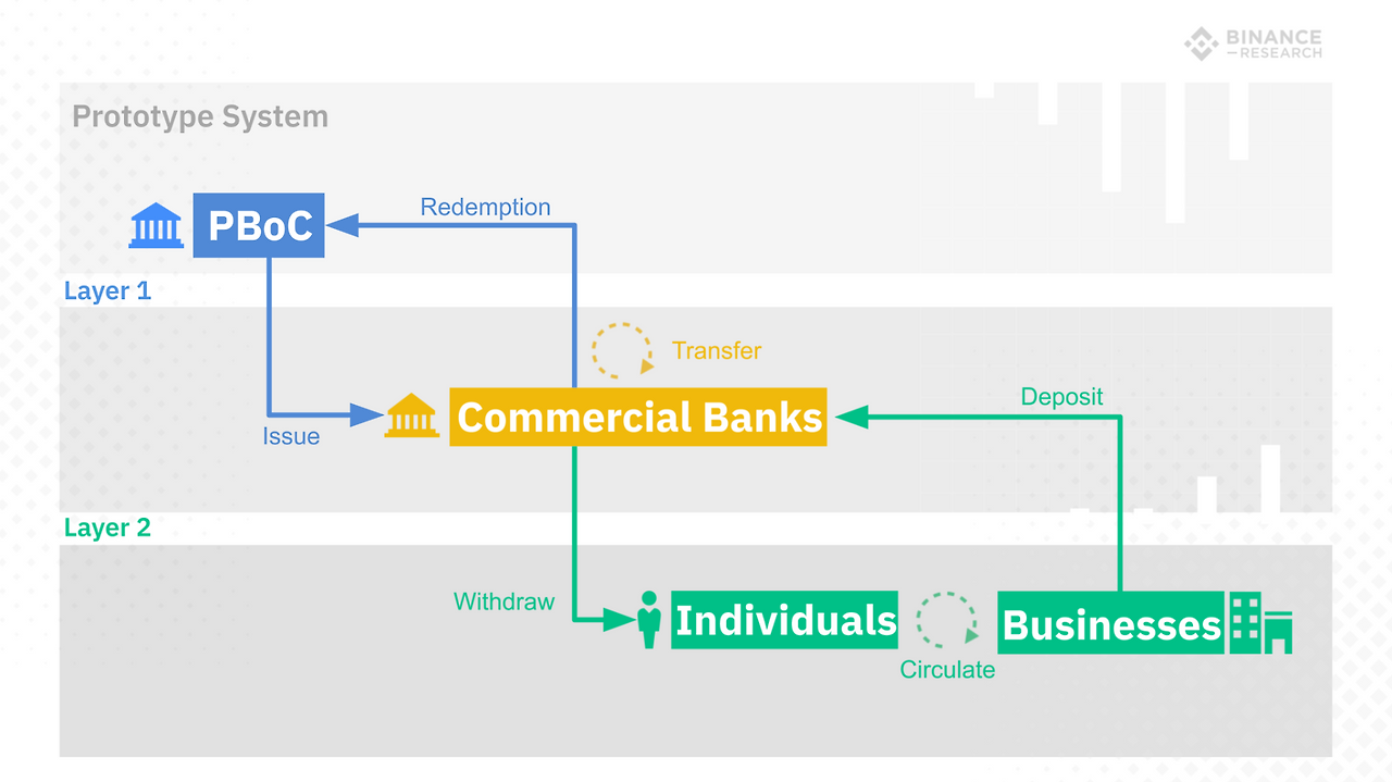 앞서도 지적했지만 중국은 발행 기관인 인민은행이 직접 이용자에게 서비스를 제공하지 않고 중간에 은행을 끼워서 서비스하게 하는 2 단계 구조를 채택한다. 한 시스템이 장애가 생겨도 전체에 영향이 없도록 하는 목적일 수 있다.