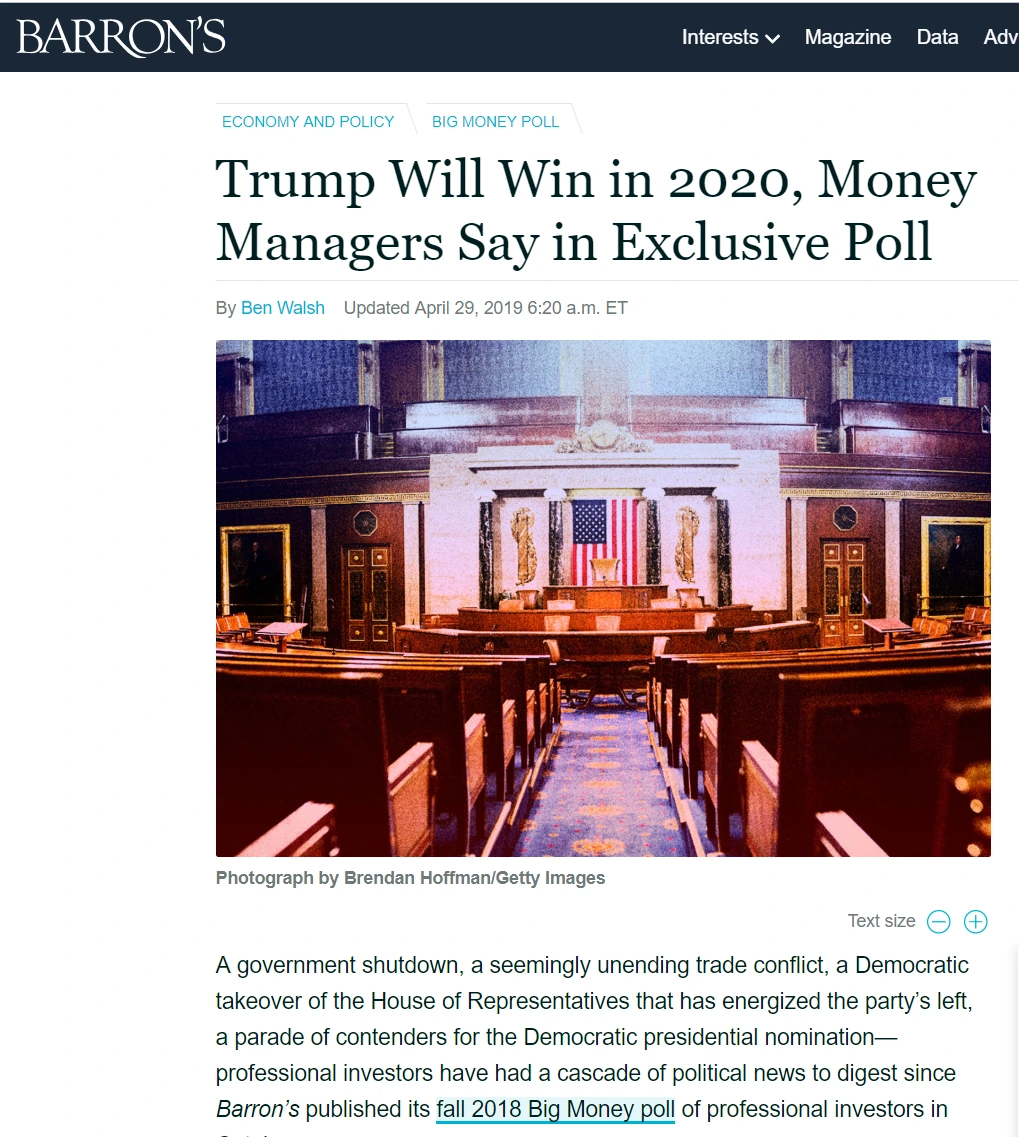 BARRON'S가 월가를 대상으로 차기 대통령에 대한 설문에서 40%가 트럼프를 지지할 것이라고 대답했다. 그리고 67%가 트럼프가 연임할 것이라고 전망했다. 상대적으로 내로라할 후보가 없는 민주당을 지지하는 비율은 31%인바 이에 비해 트럼프가 차기 대통령을 연임할 가능성이 큰 것이다. (https://www.barrons.com/articles/donald-trump-will-win-2020-election-money-managers-say-51556321235) Royal Bank of Canada 또한 70% 이상이 트럼프의 연임을 예상한다고 밝힌 바 있다.