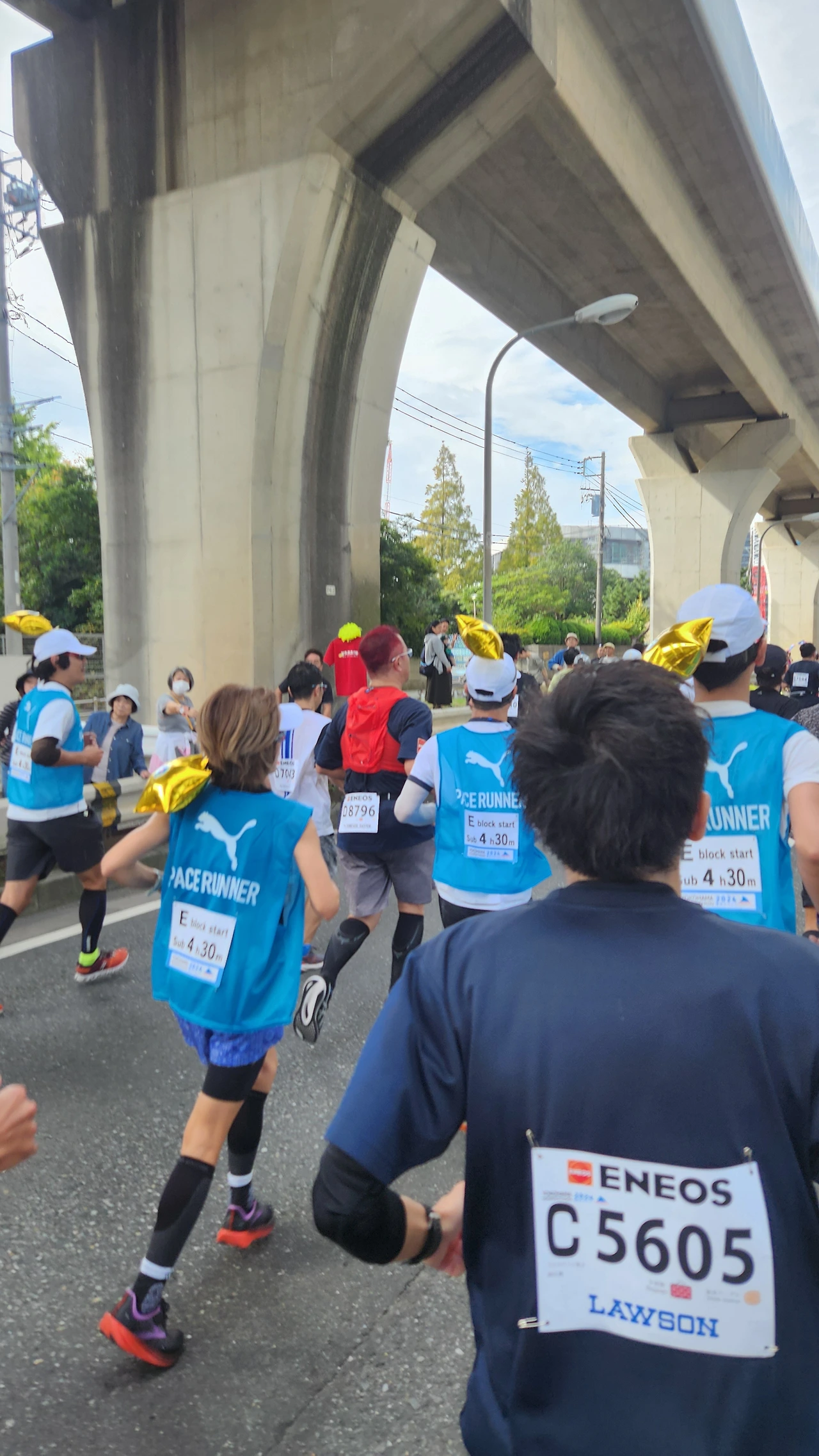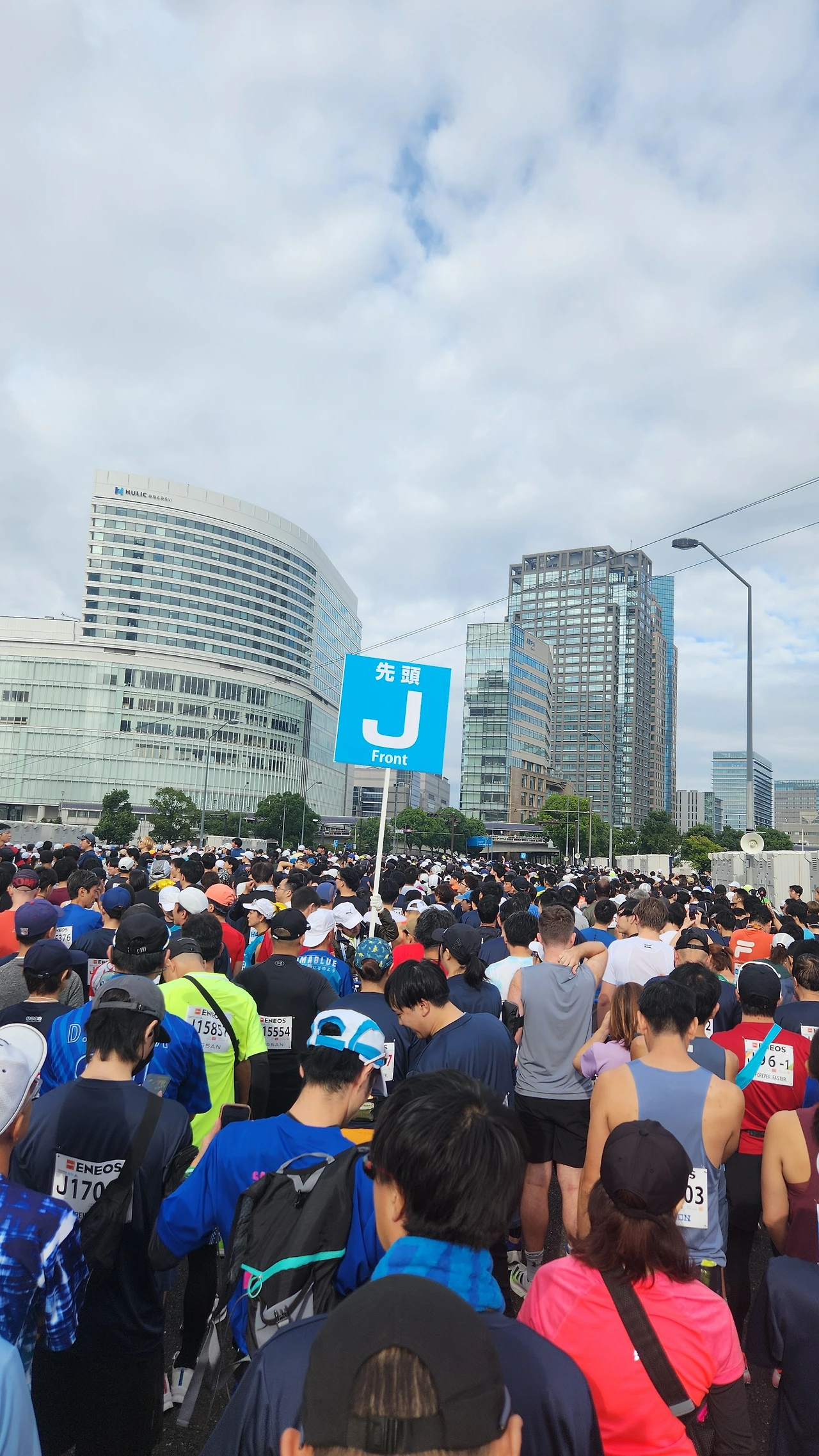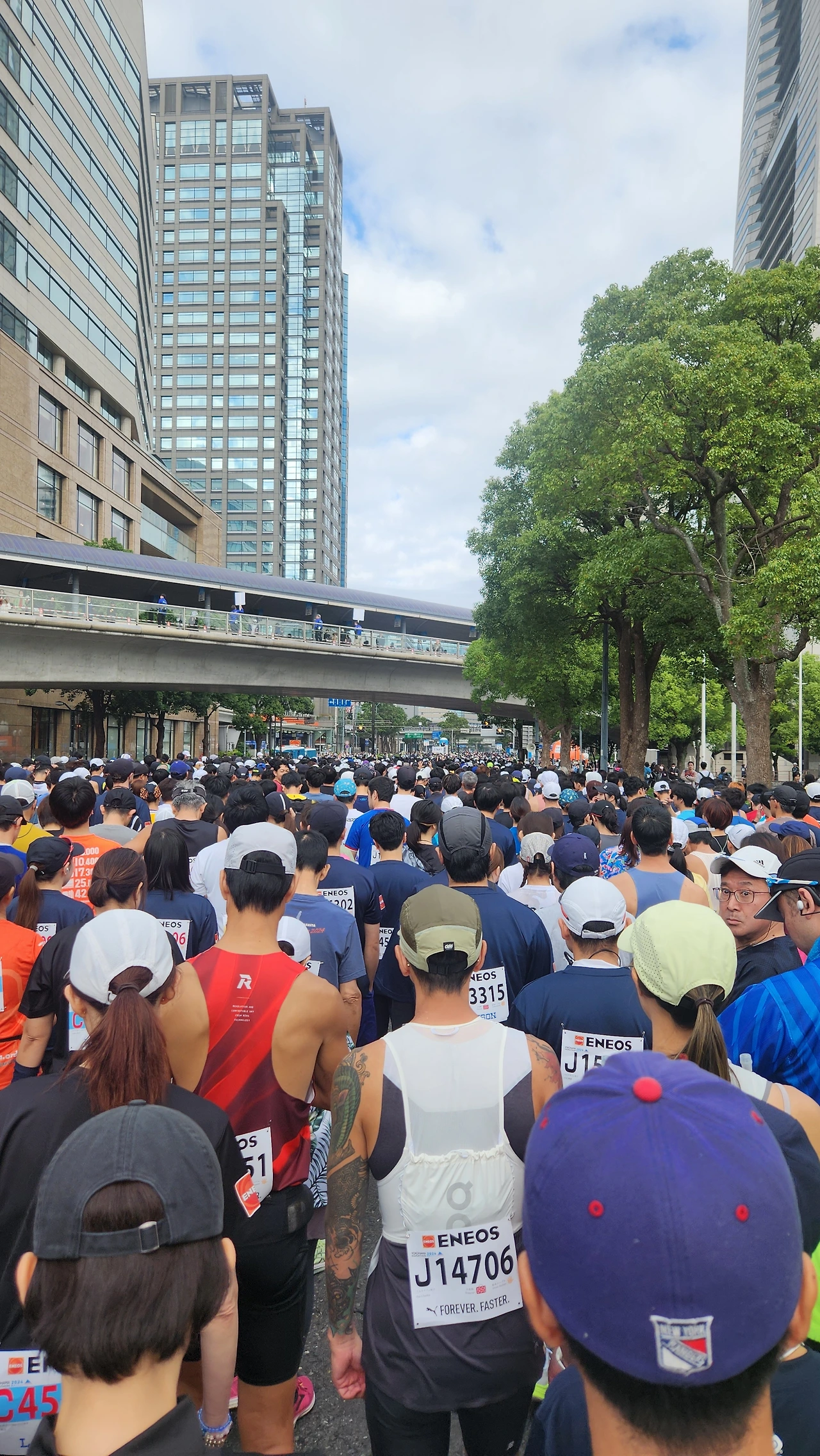 9개의 조로 나뉘어 출발한 마라톤은 그야말로 사람의 산, 사람의 파도였습니다. 한적하던 8차선 도로가 주자들로 가득 찼고, 한참 동안을 사람을 피하며 달려야 했습니다. 대회 준비는 아주 촘촘하게 되어 있었는데 급수대와 보급은 2~3킬로미터 지점마다 있었고, 간이 화장실도 주로 전역에 비치되어 있었습니다. 5킬로미터 정도의 간격으로 고적대, 치어리딩, 벨리댄스까지 지역의 많은 사람들이 간바레를 외쳐주었습니다. 급수대마다 준비된 간식들도 무척 다양했습니다. 젤리, 양갱, 오니기리, 초밥, 모나카, 모찌, 각종 종류의 달달한 사탕들까지. 다음 급수대에선 어떤 간식이 나올까 하는 상상이 지루함을 견디는데 도움이 되었습니다.