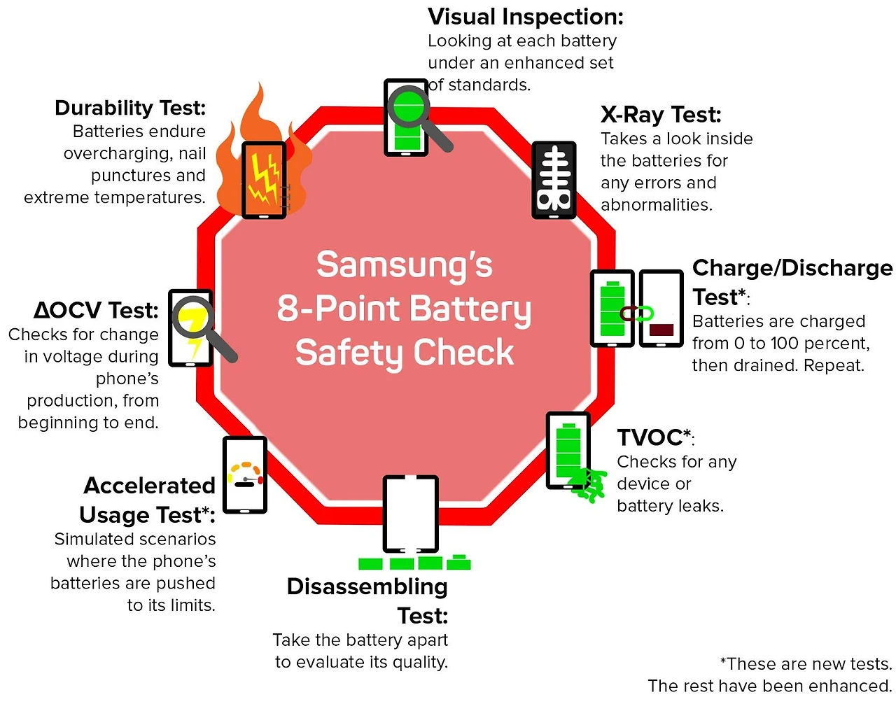 먼저, 배터리 쪽 8대 안전 대책 대부분은 고동진 사장의 작년 9월 2일 발표를 보고 필자가 지적한 ‘후공정’으로 대부분 커버할 수 있는 부분이다. 한두 개 정도 새로운 게 있다손 하더라도 그다지 효과적이지 않다. 가령, 샘플링된 베어셀 혹은 팩의 SOC 0~100% 사이의 충방전도 검수 측면에서 그다지 유효하지 않다. 이 부분은 발표장에서 8대 안전 대책으로 생산 일정이 늘어지는 게 아니냐는 기자들의 질문에 ‘그렇지 않다’란 답이 열쇠이기도 하다. 다른 공정이 고속화되지 않은 한 다수의 검수 과정이 신규로 추가됐을 때는 당연히 시간이 더 든다. 마치 대단한 8개 검수 과정이 추가된 양 포장되었으나 사실은 그렇지 않다.