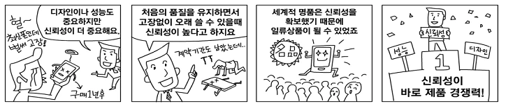 필자가 쓴 신뢰성이란 개념은 이미 잘 정립되어 있음에도 불구하고, 오용 사례가 자주 발견되며 그 중요성도 간과되기 일쑤다. 때마침 우리 정부의 소재부품 종합정보망에 신뢰성의 기본 의미가 잘 기술되어 있어 그대로 옮겨와 표현하자면 다음과 같다. ‘어떤 제품이 주어진 조건에서 고장 없이 일정시간(시간, 거리, 사이클 등) 최초의 품질 및 성능을 유지하는 특성으로, 얼마나 오랫동안 원하는 성능을 유지하며 사용할 수 있는가를 정량적 수치를 표현한 것으로 ‘품질’에 ‘시간’이라는 요소를 포함한 개념’이라 정의할 수 있다. 이 개념을 이해하는데 있어 유념해야 할 포인트는, 먼저 신뢰성은 ‘정성적'이지않은 ‘정량적’ 수치 혹은 지표(Index)로 표현되어야 하며, 그 수치는 ‘품질'에 ‘(사용)시간'이란 요소가 적절히 포함되어야 한다는 점이다. 마지막으로, ‘고장’, ‘고장률’, ‘고장 분석’이란 개념이 도입되면 신뢰성의 얼개가 어느 정도 완성된다.