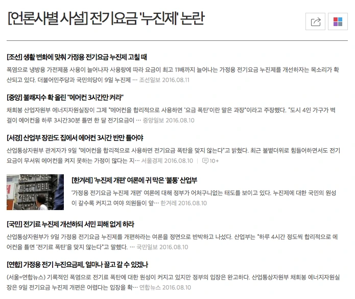 1976년 이 회의 결과는 2016년 누진율 논쟁의 초창기 모습이라 할 수 있다. 이미 무덤에 들어가도 한참 전에 들어갔을, 초기 산업화 시대 억지 주장을 답습하는 산업부와 그들의 ‘동조자’들이 토씨 조금 바꾸어 앵무새처럼 ‘자기 역할’을 수행한다(※ 사실, 산업용 전기요금은 기업 경쟁력 강화라는 핑계로 ‘당근' 역할을 충실히 수행했으니 말이다). 2000년대 후반까지 교차보조를 받으며 혜택받던 기업들은 이제 교차보조를 통해 주택용 전기요금 누진율 완화에 이바지할 때가 되었다는 주장이 외려 설득력을 얻을 상황이 바로 지금이다. 아니면, 개악된 전력산업체계와 전기원가구조를 국민들이 직접 쓰는 주택용에 맞게 재개편해야 할지도 모르겠다.