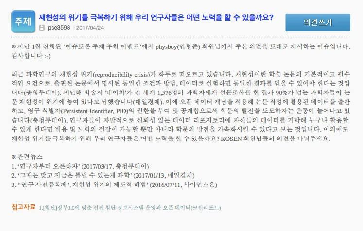 필자가 한번은 쓴다 해놓고도 깜빡깜빡하던 주제가 하나 있었다. 다른 일자의 칼럼에 살짝살짝 넣어 풀어보긴 했었지만 제대로 집중하여 이야기한 적은 없던 주제이기도 하다. 그런데 우연히 한민족과학기술자네트워크(KOSEN, 이하 코센)에서 온 이슈토론에서 이 주제를 반갑게 맞이할 수 있었다. 사람들이 대개 과학자들이 모여 있는 커뮤니티 하면 브릭을 연상하지만, 생물학 분야 이외 분들에겐 코센이 더 눈에 익은 오랜 과학 커뮤니티다. 여기서 이슈토론으로 제기한 그 주제는 바로 과학계(공학계도 포함)의 해묵은 숙제인 ‘재현성의 위기(Reproducibility Crisis)'다.