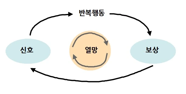”신호-행동-보상-계획“이라는 프로세스를 가지고 설명한다. 이는 바우마이스터가 이야기한 생각 최소화 – 행동 – 모니터링이라는 프로세스와는 약간의 차이가 있다.