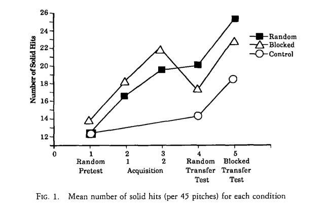 즉 무작위로 어렵게 연습을 한 B팀이 유형별로 나누어 쉽게 연습한 A팀보다 더 나은 모습을 보인 것이다. 15개의 커브볼을 연속해서 쳐보면 그 공을 칠 때 필요한 지각과 반응을 기억하기 쉬워 경기력을 향상하지만 그 효과는 얼마 못 간다는 것이다.