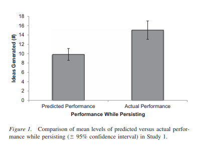 하지만 실험결과 A과제에 2차로 참여해서 나왔던 아이디어의 결과물이 1차에 비하여 훨씬 좋았고, 이는 예측한 것과 정반대의 현상이었다. (People underestimate the value of persistence for creative performance. Lucas 2015)
