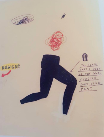 '위험'이라는 관념을 언어 기호와 달아나는 구명 바지로 표현했다. 화살표는 위험이 감추어져 있지만 곧 화면에 나타날 것임을 우리에게 말해준다. '위험'이란 단어가 달리는 다리에 대한 해석을 고정한다.