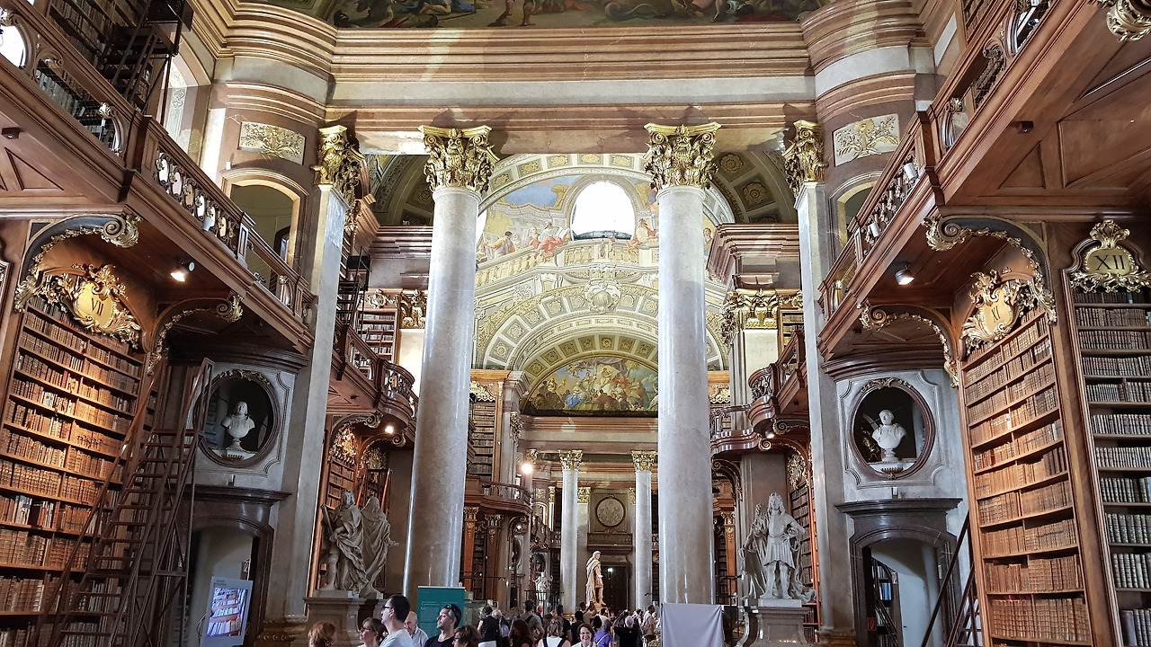 다음으로 향한 곳은 오스트리아 국립 도서관입니다. 아까 호프부르크 왕궁을 보고 나올 때 잠시 지나쳤던 곳이지만 미련이 남아 다시 돌아와 봅니다. 사실 빈에 와서 박물관이나 어디 실내 시설에 잘 입장하지 않은 이유는 너무나 비싼 입장료와 굳이 모든 박물관을 돌아볼 필요가 없다는 생각에서 비롯된 것입니다만, 그래도 도서관을 그냥 지나친다는 건 제겐 말도 안 되는 소리입니다. 입장권을 끊고 도서관에 발을 딛는 순간, 도서관에 대한 미련을 버리지 못한 저에게 탁월한 선택이었다며 지를 뻔합니다. 도서관에 들어서자마자 이게 다 무엇인가 싶습니다. 이층에 걸쳐 로마자가 새겨진 거대한 책장에 고서들로 가득 메워진 이 곳은 책의 천국 그 자체입니다. 도서관의 전시물들은 건립자 카를 6세에 대한 이야기와 소장된 책들에 대한 내용으로 한 가득합니다. 전시된 책들의 소중함, 보관의 어려움을 설명하면서 그럼에도 전시하는 이유를 강조하는데, 지식과 정보를 공유하는 도서관의 정신을 살려 전시 중이라는 말이 심금을 울립니다. 이런 멋진 도서관의 사서가 될 수 있다면 얼마나 행복할까 잠시 망상의 시간을 가져봅니다.