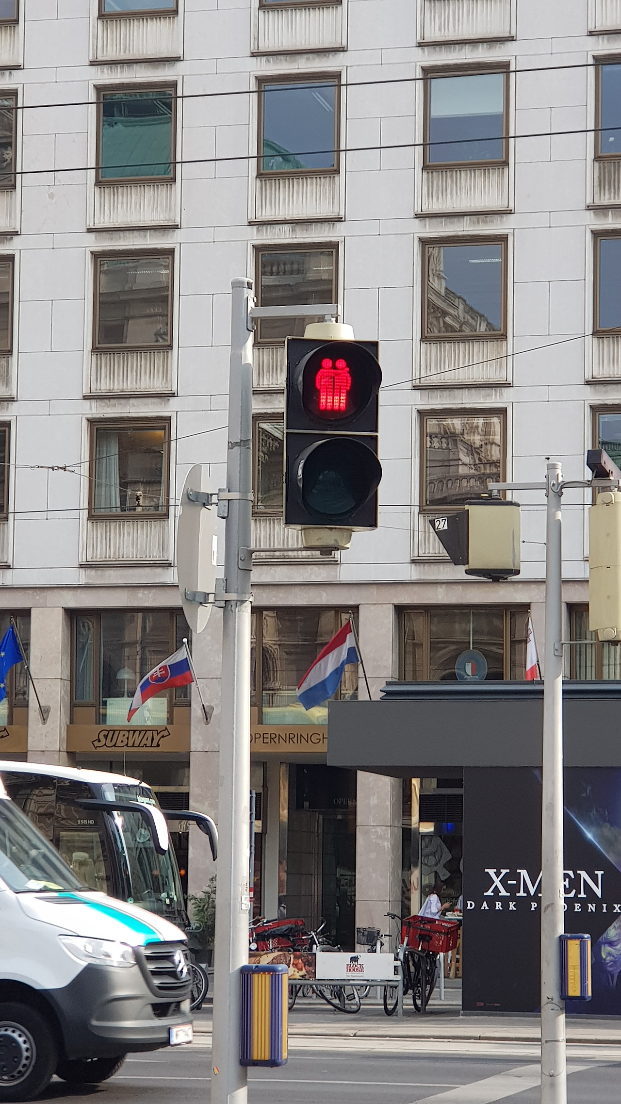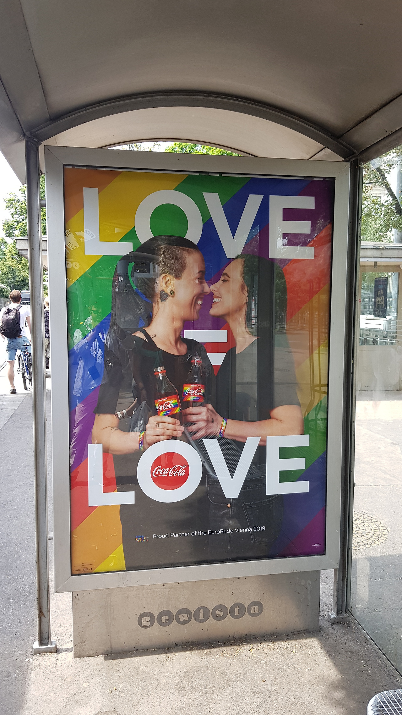 링슈트라쎄를 걸으며 주위에 재밌는 게 없나 두리번거리며 걷는데 마침 계속 신경 쓰이던 생각의 정체가 드러납니다. 독일 문화권에서는 LGBT에 대해 상당히 관대하고, 이미 사회와 문화의 일부로 받아들이고 있다는 생각입니다. 독일에서 여성끼리 키스하며 웨딩드레스를 입는 광고를 몇 번 봤지만, 빈은 뭔가 더 일상적인 곳에서 흔적을 찾을 수 있습니다. 곳곳에 무지개 색 깃발이 보이고, 코카콜라는 'Love is Love'라는 캠페인을 제품 차원에서 하고 있습니다. 가끔가다가 두 사람씩 그려진 신호등이 보이는데 빨간 불은 남자 둘이, 파란 불은 여자 둘이 함께하는 신호등입니다. 이런 사소한 흔적들이 LGBT에 대해 사람들이 어떻게 받아들이는가 보여주는 단초가 아닐까 싶습니다.