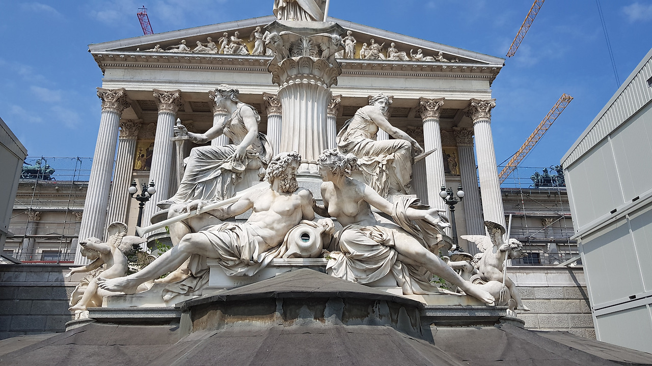 캠퍼스 광장에서 더위에 지친 다리를 마사지하며 잠시 쉰 뒤 여정을 다시 시작합니다. 중간에 부르크 극장, 오스트리아 의회의사당 등이 보입니다만 공사 중인 곳이 많습니다. 전부터 느낀 건데 유럽의 관광 명소나 유명 도시들은 언제나 무언가 공사를 하고 있습니다. 오래된 건물들인 만큼 수리와 복원에 많은 공을 들이는 거겠지만, 공사의 규모를 생각하면 보통 공을 들이는 게 아닙니다. 옛 것을 보존하고 개량한다는 의미에선 좋은 의미일 수도 있겠지만, 옛 것에 너무 집착한 나머지 새로운 건축물을 짓기 어렵다는 면에선 좋지 않은 의미일 수도 있습니다. 무엇을 중요하게 여기느냐 가치관의 차이일 것입니다.