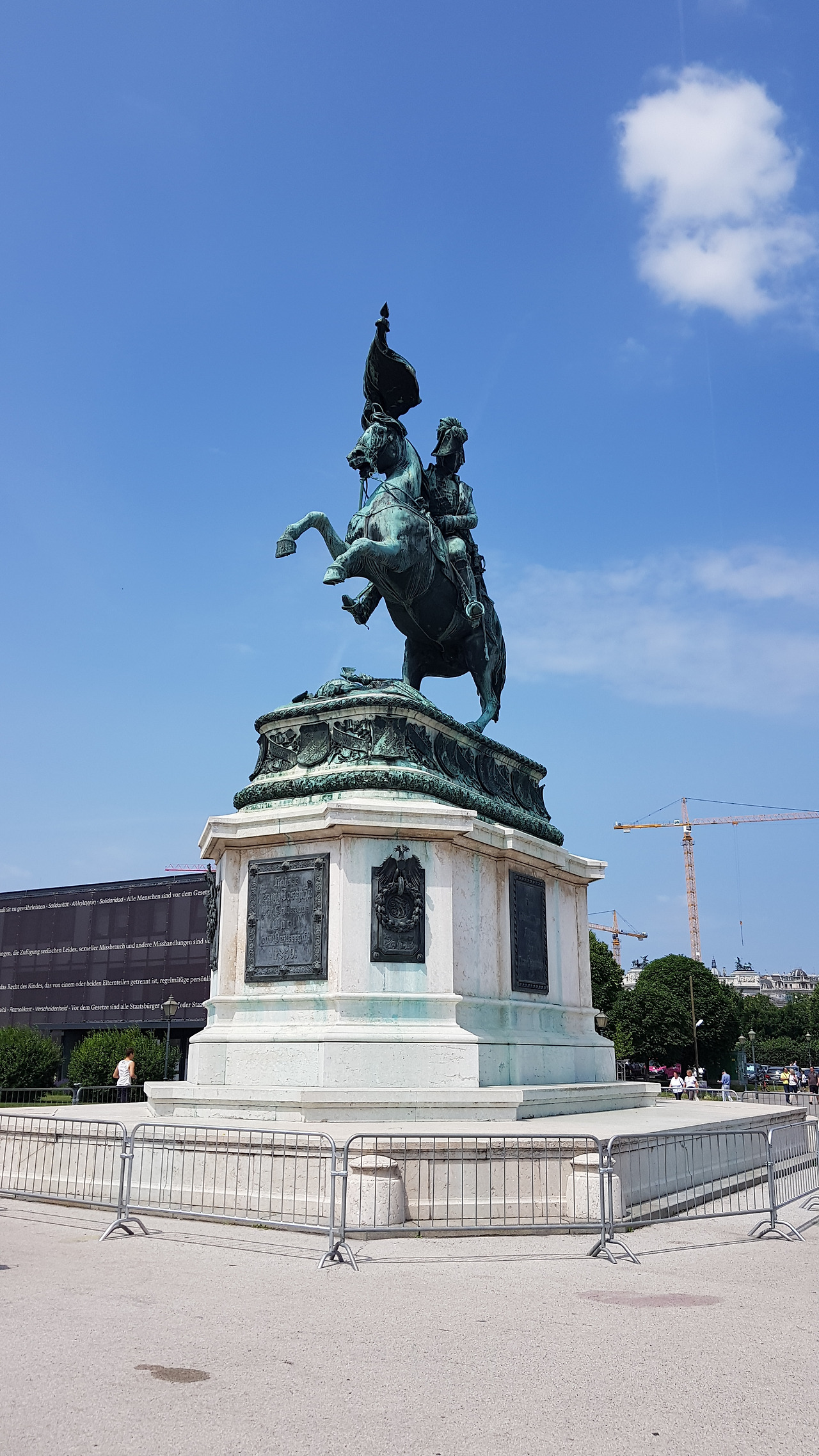 이런저런 생각을 하며 걷다 보니 헬렌 광장이 보입니다. 그리고 그 너머로 돔 형태로 퍼져있는 호프부르크 왕궁이 보입니다. 광활한 궁전을 보며 '드디어 궁전 다운 궁전을 보는구나' 생각이 듭니다. 궁전 앞에는 오이겐 공의 동상이 보이는데 말이 앞다리를 들고 돌격하는 듯한 자세가 인상 깊습니다. 100년도 더 전에 만들어진 몇십 톤짜리 동상이 고작 말 뒷다리 두 개로 지금까지 균형을 유지하다니 신기합니다. 동상이 서 있는 궁전 입구에는 마차들이 손님들을 태우고 줄지어 다니는데, 성문 앞에서 마차들이 무슨 택시처럼 줄지어 손님을 기다리고 있습니다. 근처에 마구간과 교습소도 있는 모양인데, 도심 한가운데 마차가 활보한다는 것이 좀 충격적입니다. 재미있는 광경이기는 한데 좋은지는 잘 모르겠습니다. 마차 때문에 차들이 서행하는 건 둘째 치고, 말들이 가는 길에 똥을 싸는데 치우는 사람도 없고 도로에 짓뭉게지다보니 냄새가 좀 심각합니다. 음... 별로 좋지 않습니다.