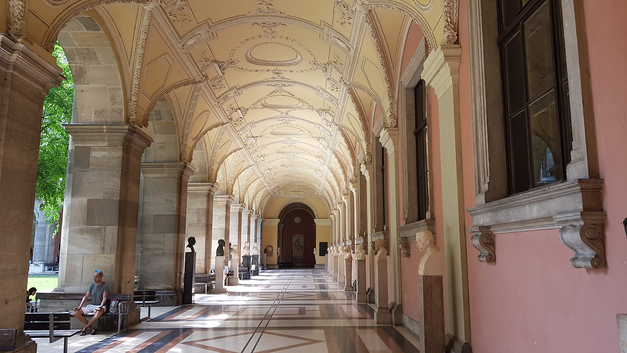 링슈트라쎄로 서쪽 외곽으로 궁전 같은 건물이 하나 보입니다. 무슨 기념관인가 싶어 살펴보니 세상에 대학교 건물입니다. 대학 정문이 무슨 궁전처럼 생겼습니다. 함부로 들어가도 되나 싶어 조금 망설이다가 사람들이 지나다니는 걸 보고 따라 들어갑니다. 예스러운 외관과는 달리 현대적인 유리문을 열고 들어가니 관광명소인 양 안내데스크가 있습니다. 투어 안내도를 따라 캠퍼스 내부를 돌아보지만 계단을 오르고 또 올라도 강의실과 세미나실밖에 보이지 않습니다. 엘리베이터도 안 보이는 건물에 계단 지옥을 거쳐 강의실로 향할 학생들에게 동정을 보냅니다.