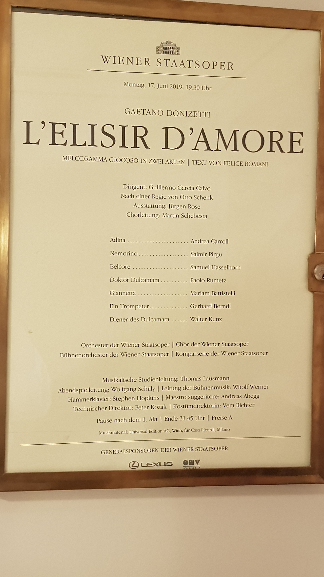 기다리는 동안 오늘 공연의 정보를 찾아봅니다. 제목은 L'elisir d'amore, 한국어로 사랑의 묘약으로 간단하게 줄거리를 요약하면 다음과 같습니다. 시골의 한 어리숙한 농부가 지주의 딸을 사랑하지만 지주의 딸은 농부의 사랑을 거부하고 군인과 혼인을 약속합니다. 좌절에 빠진 농부는 지주의 딸이 자신을 사랑하게 만드려고 상인한테 사랑의 묘약을 사지만 사실은 상인이 속여서 판 싸구려 술입니다. 당연히 효력은 없고 더 많은 묘약을 원했던 농부는 비싼 약값을 마련하기 위해 군대에 입대합니다. 자신의 인생과 바꿔 구매한 묘약을 퍼마신 다음 날, 농부의 삼촌이 급사하면서 그에게 막대한 유산이 상속되고 그 소문이 동네에 퍼져 온 동네의 여자들에게 구애를 합니다. 농부는 진실을 모르고 그저 묘약의 효력인 줄 알죠. 한편 묘약과 농부의 입대에 관한 사실을 상인에게 들은 지주의 딸은 그의 사랑이 진심이었음을 깨닫고 농부에게 사랑을 고백하고 둘은 맺어지게 됩니다. 마지막에 지주의 딸은 결혼을 약속했던 군인에게 농부의 입대 계약서를 돌려주고 파혼을 선언하며 이야기는 박수와 함께 막을 내립니다.