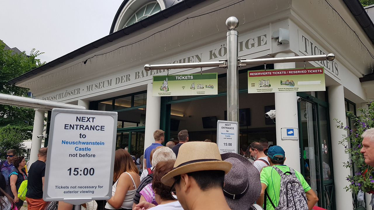 많은 사람들이 이 판타지스러운 분위기를 느끼기 위해 퓌센으로 찾아오는 모양입니다. 티켓 판매소엔 인기 있는 놀이기구 대기줄처럼 사람이 한가득 합니다. 대기줄 시작 지점에는 오후 3시부터 관람이 가능하다는 팻말이 붙어있습니다. 이제 겨우 오전 11시인데 말이죠. 미리 예약을 했으면 좋았을 텐데, 3일 전에 예약하려고 보니 이미 예약이 꽉 차서 현장 구매밖에 방법이 없었습니다. 다소 기다리는 걸 감안하더라도 어쩔 수 없다는 생각으로 왔는데, 한 시간 반을 기다려서야 겨우 티켓을 끊게 됩니다. 굳이 외관만 둘러보고 올 거면 표를 끊을 필요가 없지만, 이왕 온 거 역시 성 내부 투어까지 하고 가야 하지 않을까요?