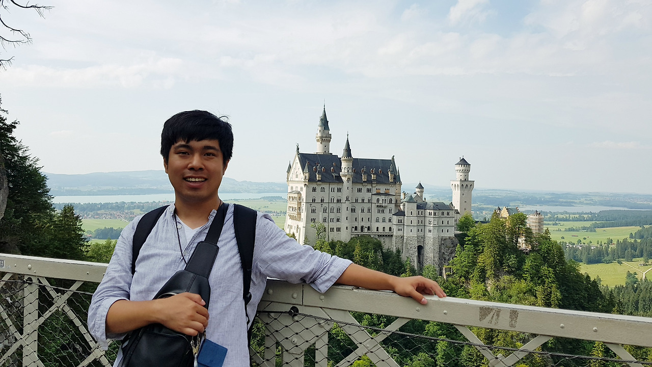 성 내부 투어를 마치니 성 전체 모습을 담고 싶은 욕심이 생깁니다. 성 뒤편으로 산길을 더 올라가면 마리엔 다리가 있습니다. 철골 구조에 목재 바닥으로 된 다리는 사진을 찍는 사람들로 빼곡합니다. 들어갈 공간이 없어 한참을 기다린 다음에야 겨우 다리에 들어갈 수 있습니다. 삐그덕 거리는 바닥에 현기증을 느끼며 조심히 걸어 나가 보니 노이슈반슈타인 성의 전경이 눈에 확 들어옵니다. 특히 양쪽에 절벽을 끼고 화창한 하늘 아래 숲이 우거진 한가운데 보이는 노이슈반슈타인 성은 드디어 동화 속 한 장면 같이 느껴집니다. 상당히 고생하면서 올라온 길인데 이런 절경을 보기 위해서라면 얼마든지 더 고생을 해도 괜찮을 듯합니다. 사람들이 북적거리는 좁은 다리에서 어떻게든 틈을 만들어 사진을 연발하며 찍어봅니다. 힘들게 올라왔으니 기념사진도 한 장 찍고요.