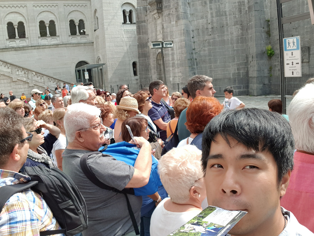 배낭을 앞으로 메고 입장을 기다리는 우리 타임 투어 팀