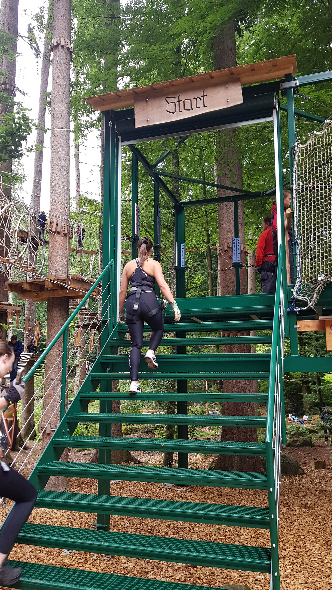 이 지점을 몇 번을 통과했는지 모릅니다열 개가 조금 넘는 코스는 난이도에 따라서 그린, 블루, 레드, 블랙으로 나뉩니다. 난이도는 길이, 높이, 장애물의 흔들리는 정도와 필요한 근력의 정도에 따라 구분이 되는 모양입니다. 일단 가벼운 마음으로 가장 쉬운 난이도인 그린 코스부터 출발합니다만, 시작하자마자 줄타기를 하며 공원의 글자가 새겨진 목판을 클라이밍 하는 것이 시작부터 만만치가 않습니다. 사다리를 타거나 그물을 건너거나 짚라인을 타거나 클라이밍을 하는 등 쉽지 않은 코스가 계속 이어집니다.