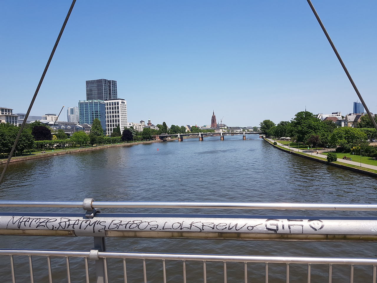 어느덧 3시가 가까워진 시간, 저는 역에서 짐을 찾고 숙소로 이동해서 하루 일정을 마치기로 결심합니다. 시차와 피로 때문에 몸이 더 버티지 못합니다. 어차피 프랑크푸르트에서의 일정을 길게 잡았으므로 조급할 필요는 없습니다. 숙소는 역에서 그리 멀지 않아 30분 정도만 걸어가면 됩니다. 마인강을 따라 걸어가는데 정경이 수채화 풍경처럼 느껴집니다. 더위와 피로만 없었다면 좀 더 천천히 만끽하면서 걸어갔을 겁니다. 특히 강에 놓인 다리들이 인상 깊습니다.