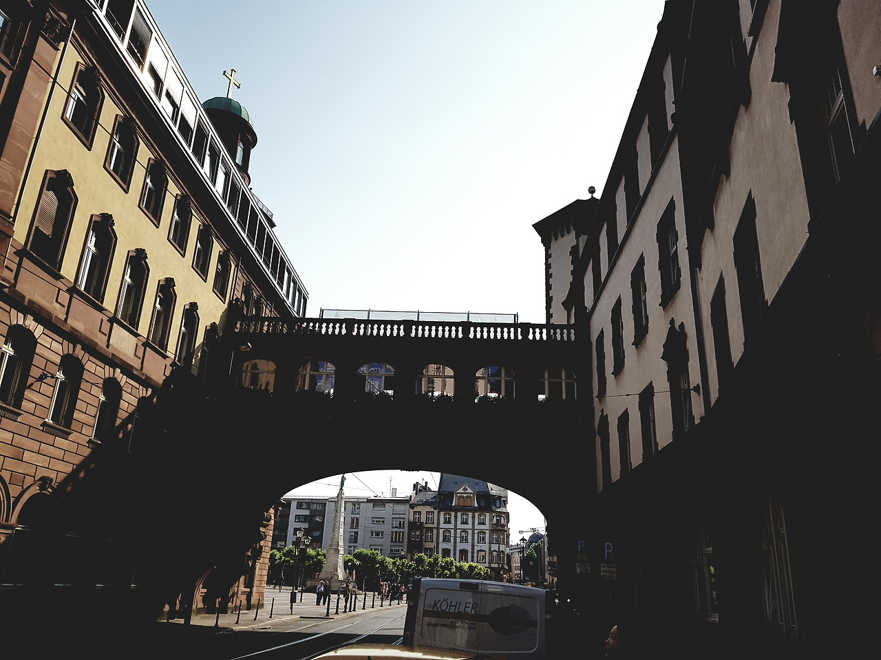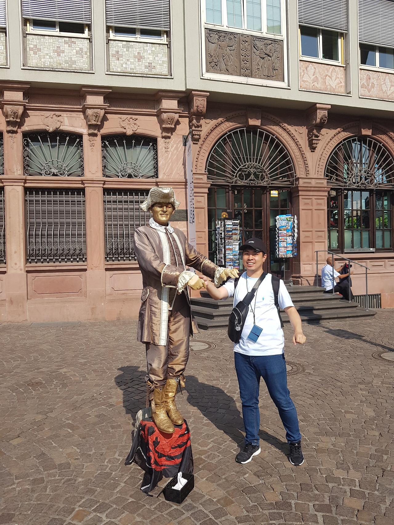 하여튼 그렇게 역사를 나가서 아무 생각 없이 사람들 따라 길을 걸어갑니다. 역사 정면으로 큰 길이 나 있고 양 옆으로 유리로 된 빌딩들이 줄 지어 서 있습니다. 길가에 온갖 국가의 음식점들이 있는 걸 보고 여기가 새삼 국제도시란 생각이 듭니다. 사람들의 행렬을 따라 걷다 보니 거대한 유로 마크가 보입니다. 유로 타워 앞에 설치된 유로 마크가 프랑크푸르트는 독일의 경제를 상징하는 도시라고 자랑하는 듯합니다. 간단하게 기념사진을 찍으려고 폼 잡는데 한국인 세 분이 말을 걸어옵니다. 서로 사진을 찍어주면 좋을 것 같다는 이야기입니다. 마침 세 분이 뢰머 광장으로 가신다길래 저도 동행하면서 사진을 찍습니다. 낯선 도시의 모습 들을 배경으로 사진을 찍는 것이 여간 재밌는 게 아닙니다. 광장에 도착해서도 몇 장 찍습니다. 살아있는 동상을 연기하는 분과 사진을 찍는데 보너스 정신이 투철합니다. 광장에 가득 찬 사람들을 구경하며 일행들과 헤어지고 저는 갈 길을 갑니다.