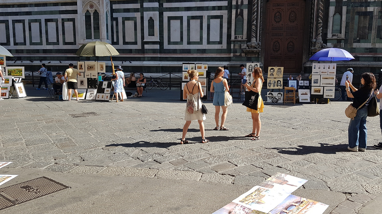 잠시 숙소에서 휴식을 취한 후 피렌체의 상징, 두오모를 보러 출발합니다. 피렌체의 곧게 뻗은 좁은 도로에는 '예술의 도시'가 아니랄까 봐 온통 예술품을 늘여놓고 파는 사람들 천지입니다. 사람들 사이를 비켜 다니며 걷다 보니, 좁은 도로의 끝에는 대리석으로 번쩍이는 두오모 대성당이 기다리고 있습니다. 저는 그 위용에 넋을 잃고 고개를 들고 천천히 걸어갑니다만, 갑자기 어떤 사람이 소리를 지르며 저를 불러 세웁니다. 그 사람은 화난 표정으로 그림 두 장을 들어 올리며 신발 자국을 손으로 가리킵니다. 제가 바닥에 깔아 놓은 그림을 밟고 지나갔다며 돈을 내놓으라는 겁니다. 일단 크게 실수했구나 싶은 생각과 함께 당혹해하고 있는데, 몇 사람이 달려들어 겁박하는 모습에 순식간에 사기라는 사실을 깨닫습니다. 아무래도 내가 사기에 어울려줄 필요는 없겠다 싶어서 그대로 도망가려고 뒤로 돈 순간에 일당 중 한 사람이 제 손목을 붙잡고한 구석으로 끌고 갑니다. 그는 골목 한 구석에서 그림값이 100유로니 최소한 50유로는 물어내야 한다고 몰아붙입니다. 저는 최대한 겁먹은 표정을 지으며 벌벌 떠는 손으로 돈이 없다고, 내가 도와줄 방법이 없다고 울먹거립니다. 나는 가진 것이 동전밖에 없으니 이제 어떻게 하면 좋겠냐며 한탄을 하자 그 사람이 그거라도 내놓으라고 소리칩니다. 저는 잔돈 주머니를 꺼내, 50센트, 20센트, 이렇게 동전을 하나둘씩 꺼냅니다. 그것도 벌벌 떨리는 손으로 하나하나 동전을 꺼냅니다. 한 8유로쯤 꺼내자 그 사람은 답답했는지 그거라도 됐다며 제 손에서 동전들을 쓸어갑니다.