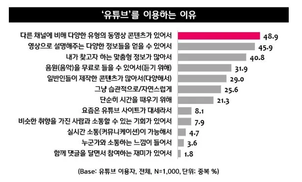 유튜브 사용 연령이 점점 다양화되면서, 사람들이 유튜브를 이용하는 이유에 '정보' 탐색에 관련된 비중이 45%를 차지하고 있습니다.