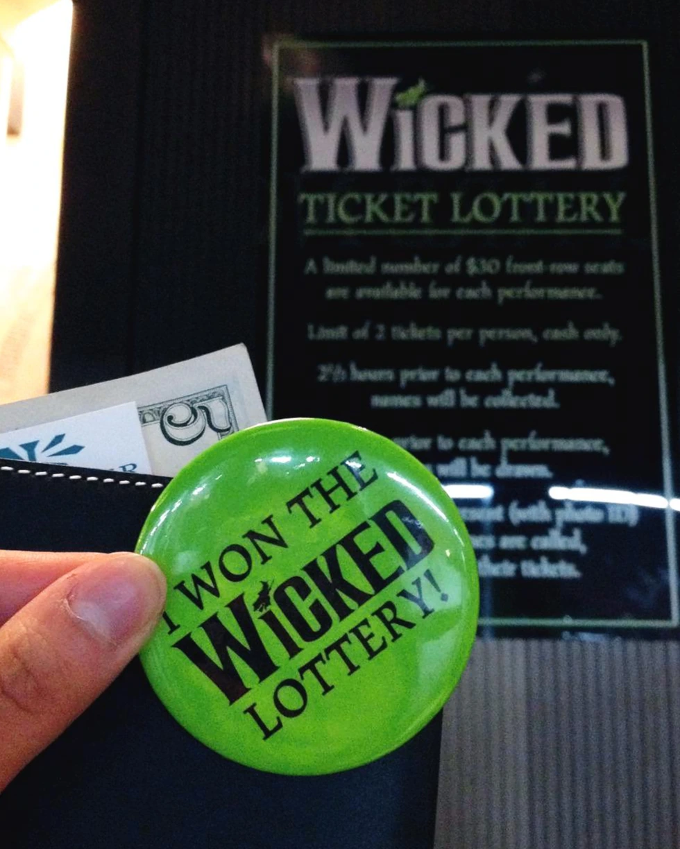 이름을 다시 한번 확인한 후 지불할 현금이 있는지 확인했다. 스태프가 작은 배지를 주면서 ‘자 이건 네 거야’라고 말했다. 초록색 바탕에 ‘I won wicked lottery!’라고 쓰인 배지였다. 티켓 창구에서 여권을 보여주고 드디어 티켓을 받았다. 어떤 사람은 무대가 너무 가까워 별로였다고 하는데 나는 배우들의 모습을 더 가까이 볼 수 있어 기대가 되었다. 문득 내 좌석은 어디일까 궁금해졌다. 티켓 창구의 아저씨는 좌석 지도에서 내가 앉을자리를 가르쳐주었다. 무대 바로 앞에 있는 첫 번째 좌석의 오른쪽이었다. 아주 중앙도 아니지만 그렇다고 아주 가장자리도 아닌, 무난한 위치였다. 방금 티켓을 받아간 여자애가 좌석까지 확인하러 온 것이 웃겼는지 아저씨는 좋은 하루 되라고 이야기해주었다. 나는 호들갑을 떨며 밖으로 나갔다.